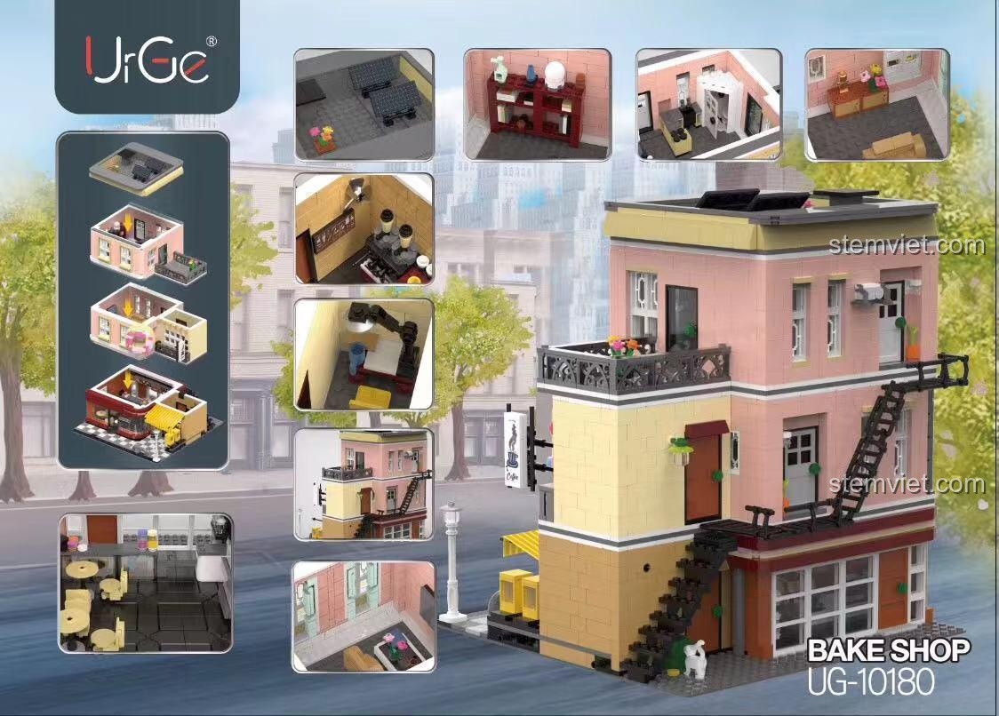Điều làm nên sự khác biệt của bộ xếp hình UrGe này chính là không gian nội thất được chăm chút kỹ lưỡng. Tầng một là tiệm bánh với quầy kệ, bàn ghế cho khách và khu vực làm bánh. Tầng hai là một căn hộ ấm cúng với phòng khách, phòng ngủ và cả phòng tắm. Tầng thượng là không gian thư giãn ngoài trời. Mỗi căn phòng đều được trang bị đầy đủ đồ đạc, cho phép bé thỏa sức tưởng tượng và sáng tạo nên những câu chuyện của riêng mình.