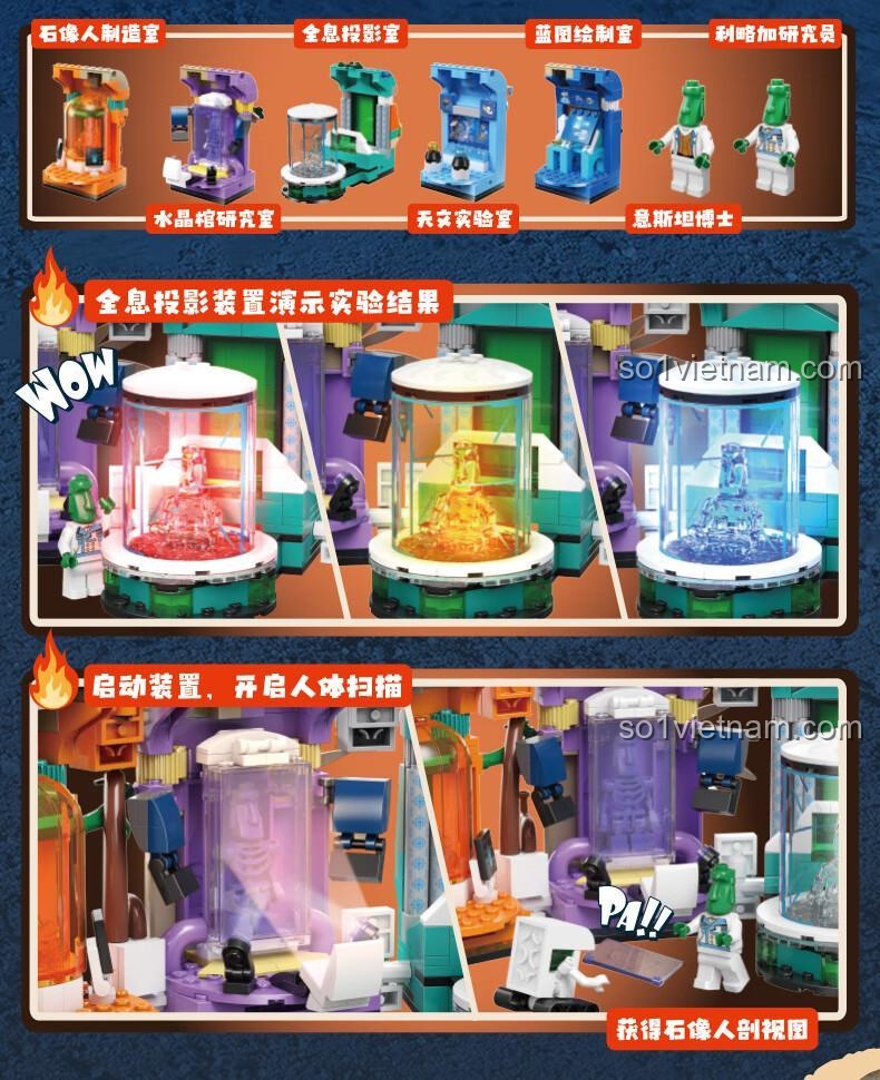 • Kịch bản 5: Nâng cấp phòng thí nghiệm: Kết hợp bộ đồ chơi này với các bộ khác để mở rộng trung tâm nghiên cứu, xây thêm khu vực năng lượng hoặc nhà chứa phương tiện.
