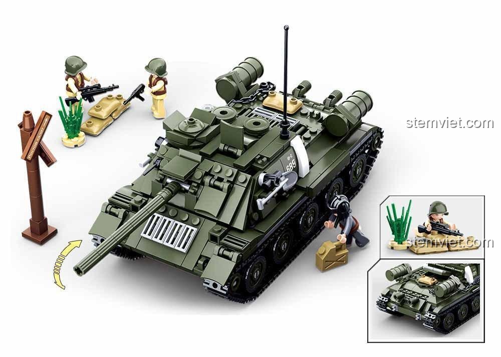 Dạ, bộ sản phẩm bao gồm 2 mô hình chính là xe bán xích và pháo, cùng với 3 minifigure binh lính và các phụ kiện vũ khí cá nhân đi kèm, đủ để bé tạo nên một phân cảnh chiến đấu nhỏ.