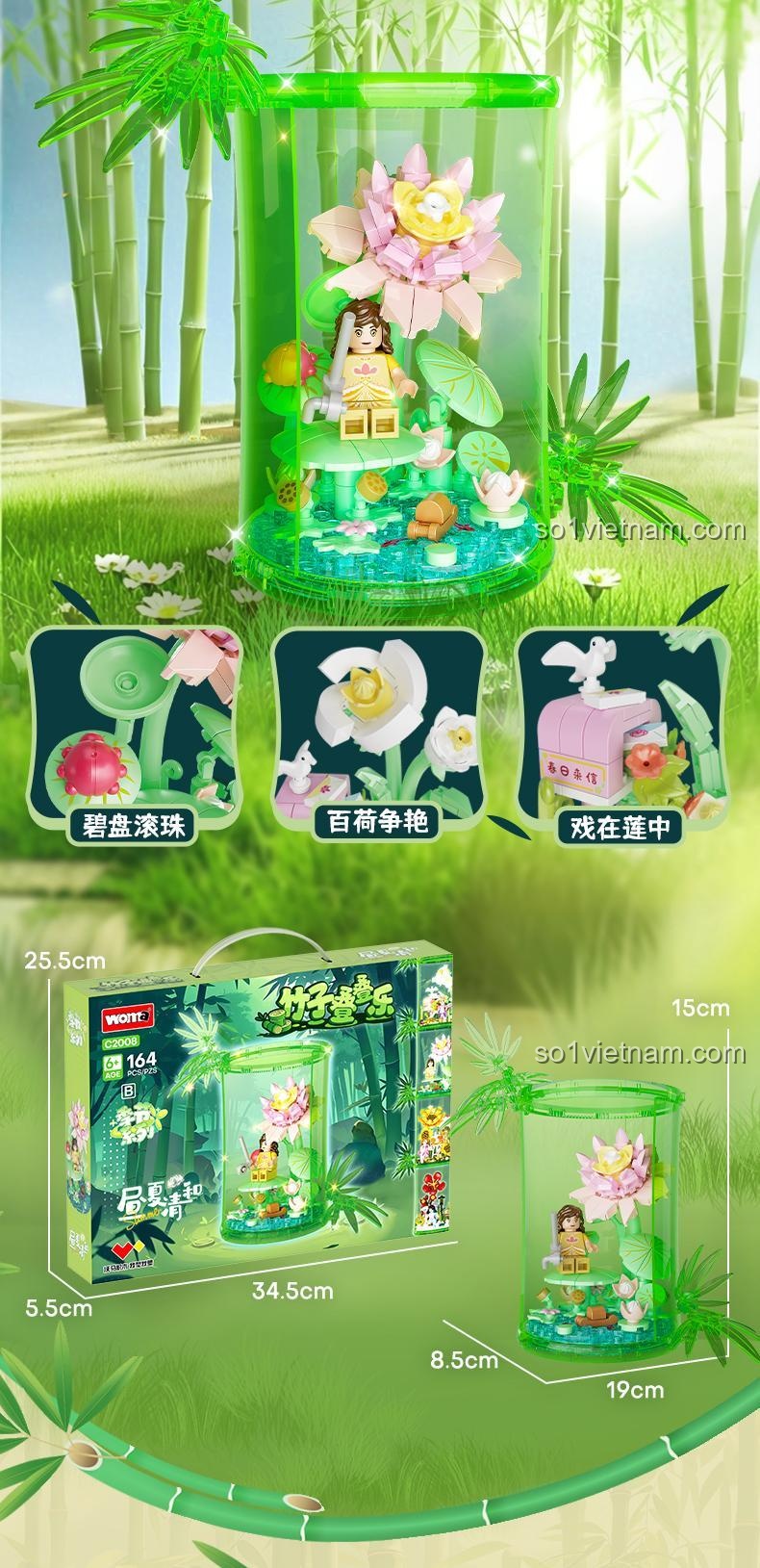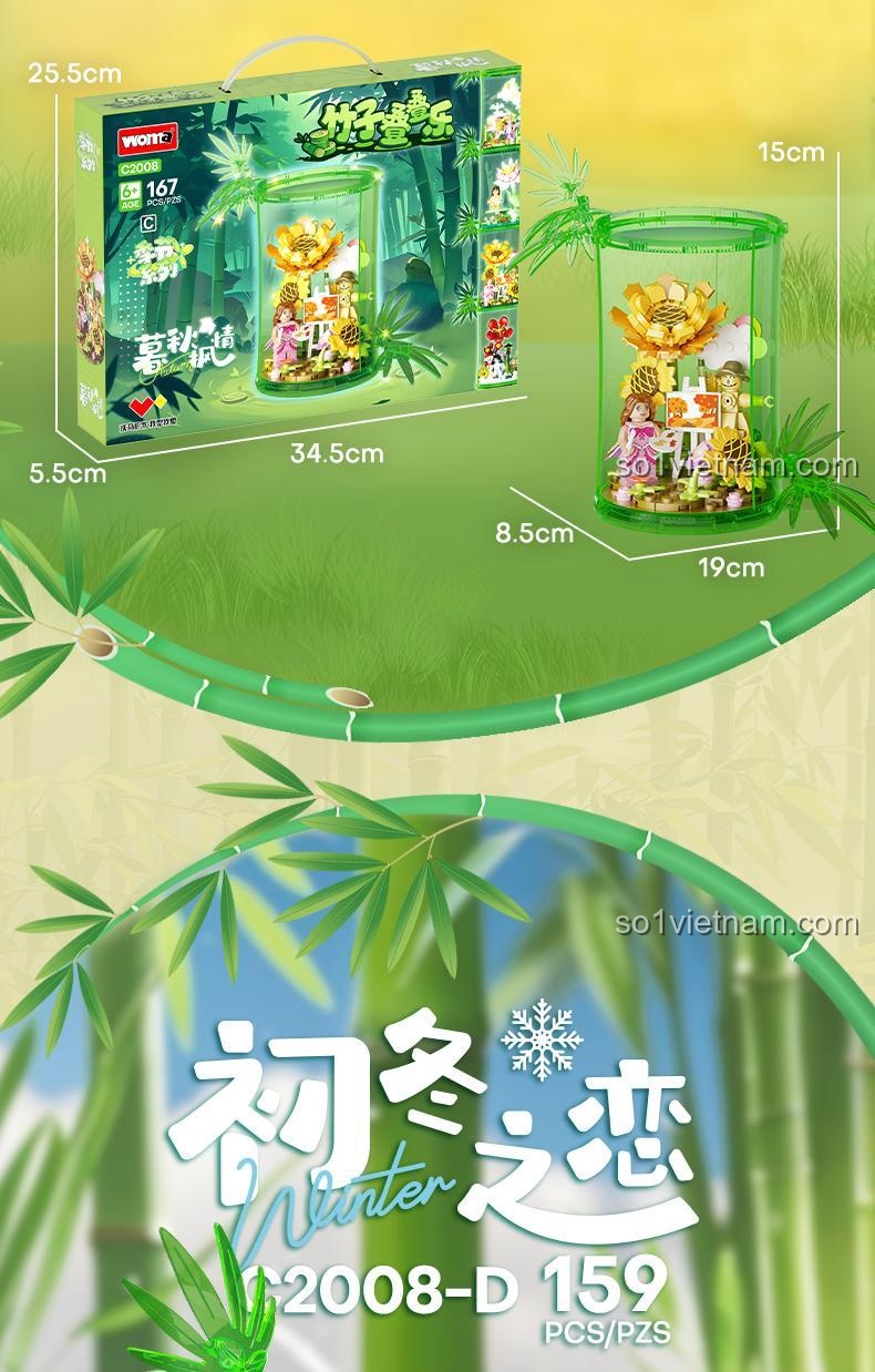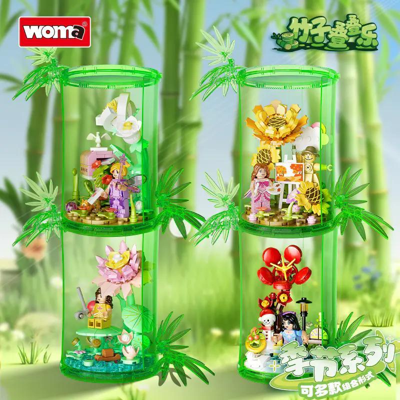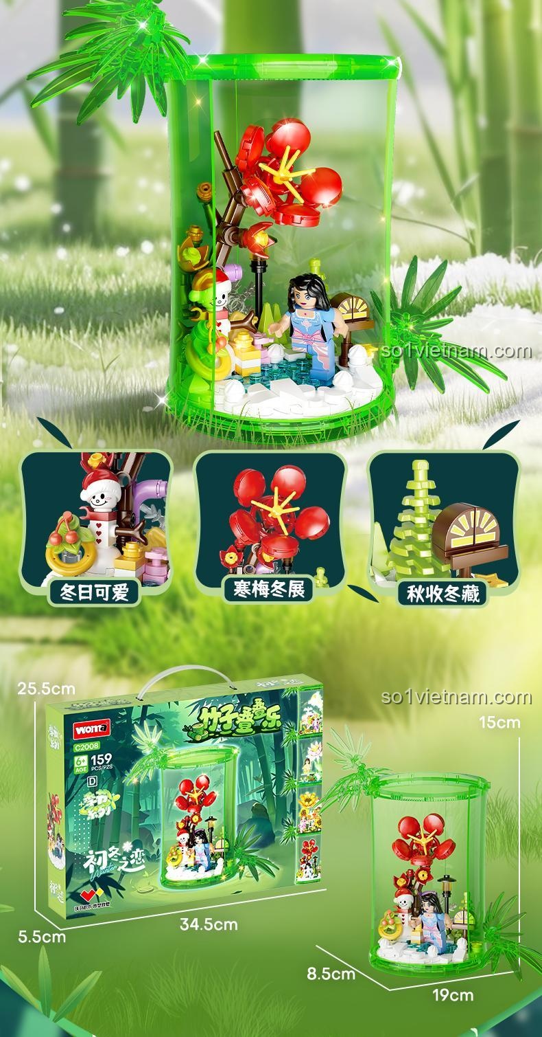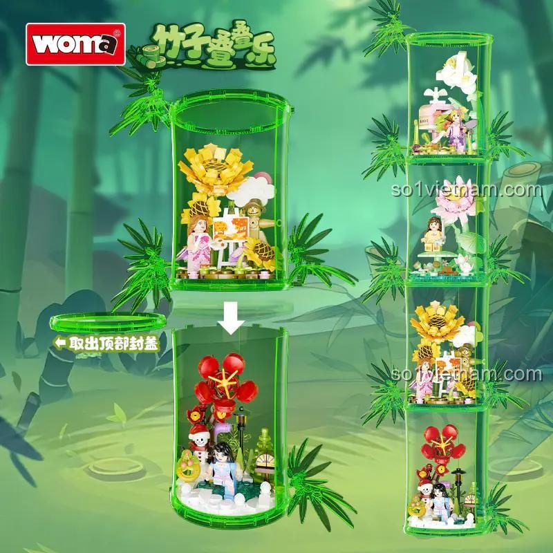 Điểm khiến đồ chơi mô hình Khung cảnh Xuân Hạ Thu Đông WOMA C2008 trở nên khác biệt chính là ý tưởng thiết kế đột phá và đầy tính nghệ thuật. Thay vì những chiếc hộp vuông vức, mỗi khung cảnh được đặt trong một chiếc hộp tròn trong suốt, mô phỏng hình dáng của một đốt tre xanh mướt. Điều này không chỉ tạo ra một hiệu ứng thị giác đẹp mắt mà còn gợi lên cảm giác gần gũi với thiên nhiên.