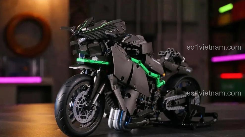 Vẻ đẹp của đồ chơi mô hình ZHEGAO QJ5183 không chỉ nằm ở dáng vẻ hầm hố bên ngoài, mà còn ở bộ khung Technic tinh xảo bên trong. Với tông màu đen chủ đạo mạnh mẽ, điểm xuyết bằng những chi tiết khung sườn màu xanh lá đặc trưng của Kawasaki, mô hình này toát lên một vẻ đẹp đầy uy lực và tốc độ. Kích thước sau khi hoàn thiện lên tới 34.6cm chiều dài, 10cm chiều rộng và 19.7cm chiều cao, tạo nên một tác phẩm trưng bày vô cùng ấn tượng trong phòng của bé. Từng chi tiết nhỏ nhất đều được chăm chút tỉ mỉ: từ hệ thống ống xả phức tạp, khối động cơ lộ ra ngoài, cặp phuộc nhún trước sau, cho đến hệ thống truyền động bằng xích nối từ bánh sau lên động cơ. Thiết kế dạng ‘mở’ của dòng Technic cho phép bé quan sát và hiểu rõ cách các bộ phận cơ khí phối hợp với nhau để tạo ra chuyển động. Đây chính là điểm ăn tiền, biến một mô hình tĩnh thành một bài học trực quan sinh động về kỹ thuật, một trải nghiệm mà bất kỳ cậu bé nào cũng sẽ say mê.