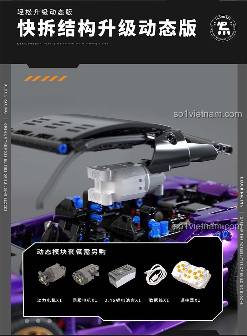Điều làm nên sự khác biệt của đồ chơi xây dựng Tuomu T1002 không chỉ nằm ở vẻ ngoài bắt mắt, mà còn ở những tính năng tương tác đầy thú vị. Vô lăng của xe có thể xoay và kết nối trực tiếp với hệ thống lái của bánh trước, giúp bé có thể điều hướng xe một cách chân thực. Cặp cửa cắt kéo không chỉ để trưng bày mà còn có thể mở lên, đóng xuống mượt mà, cho phép bé khám phá không gian nội thất chi tiết bên trong. Nhưng điểm đắt giá nhất chính là khả năng “biến hình”! Sản phẩm được thiết kế với cấu trúc mô-đun thông minh, cho phép mẹ có thể dễ dàng nâng cấp nó thành một chiếc xe điều khiển từ xa thực thụ chỉ bằng cách trang bị thêm bộ động cơ và điều khiển (được bán riêng). Hãy tưởng tượng niềm vui và sự phấn khích của con trai khi chiếc siêu xe do chính tay mình lắp ráp có thể lao vun vút trên sàn nhà theo từng nút bấm điều khiển. Từ một mô hình tĩnh, nó biến thành một món đồ chơi vận động đầy hứng khởi, mang lại giá trị chơi gấp bội.