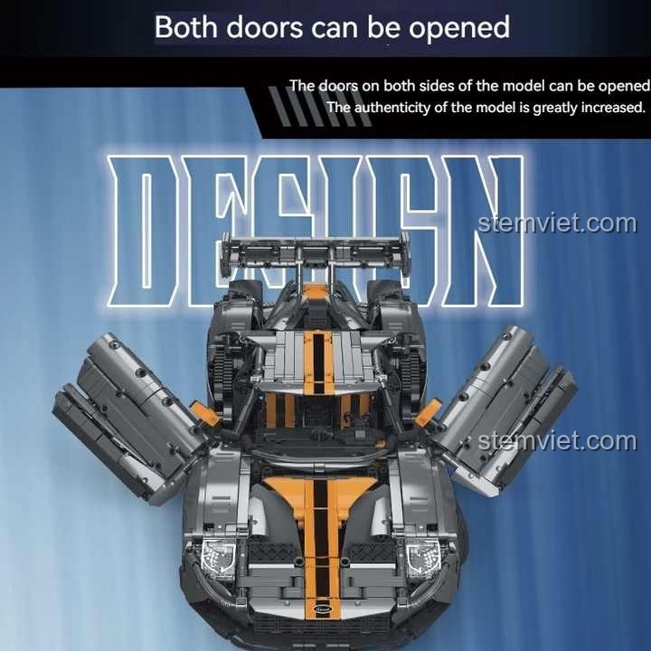 Với tỉ lệ 1:8 hoành tráng, mô hình sau khi hoàn thành sẽ có kích thước ấn tượng dài gần 60cm, một con số đủ để làm mọi người phải trầm trồ. Khoác lên mình bộ cánh màu xám bạc mạnh mẽ, điểm xuyết bằng những đường sọc cam thể thao và các chi tiết đen hầm hố, Mô hình xe đua GT MORK toát lên vẻ đẹp của một cỗ máy tốc độ thực thụ. Thiết kế khí động học tinh xảo, từ cánh gió sau khổng lồ, hốc hút gió cho đến bộ khuếch tán sau, tất cả đều được tái hiện một cách tỉ mỉ. Điểm nhấn đặc biệt chính là cặp cửa cánh bướm có thể mở lên đầy kiêu hãnh, để lộ ra khoang nội thất chi tiết bên trong với vô lăng, ghế ngồi và bảng điều khiển. Đây không chỉ là một mô hình tĩnh, mà là một tác phẩm nghệ thuật cơ khí sống động, sẵn sàng để bé trưng bày trong phòng hoặc khởi động cho những cuộc đua tưởng tượng.