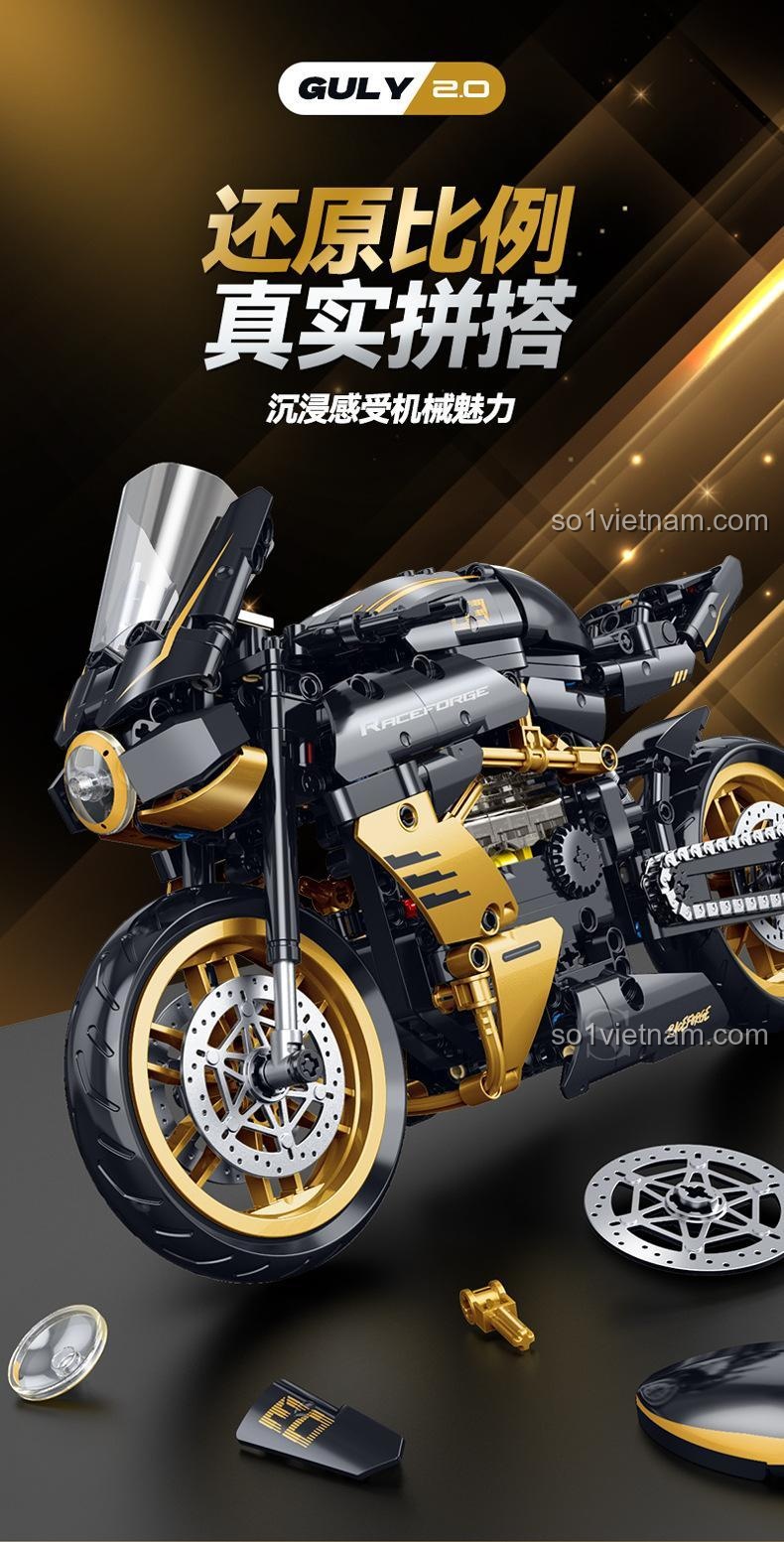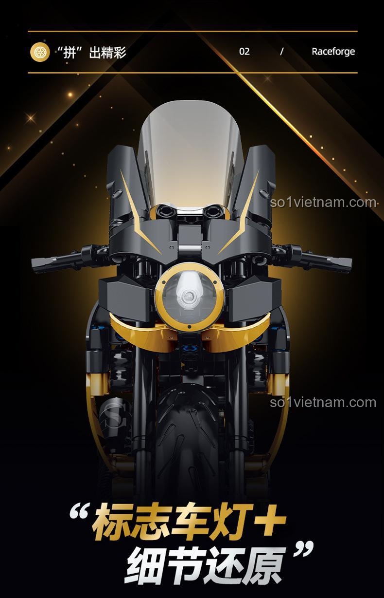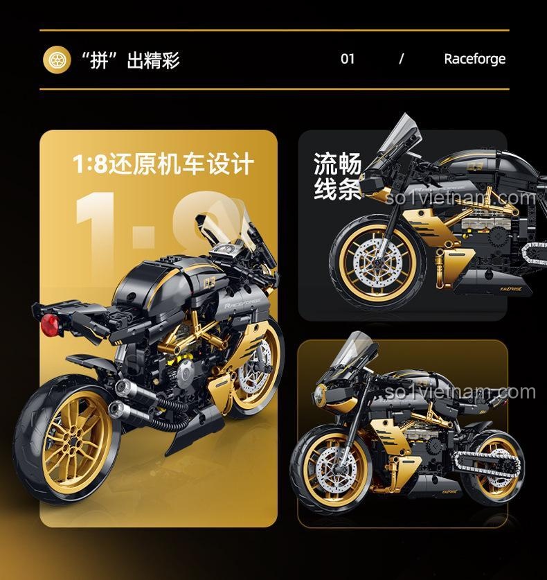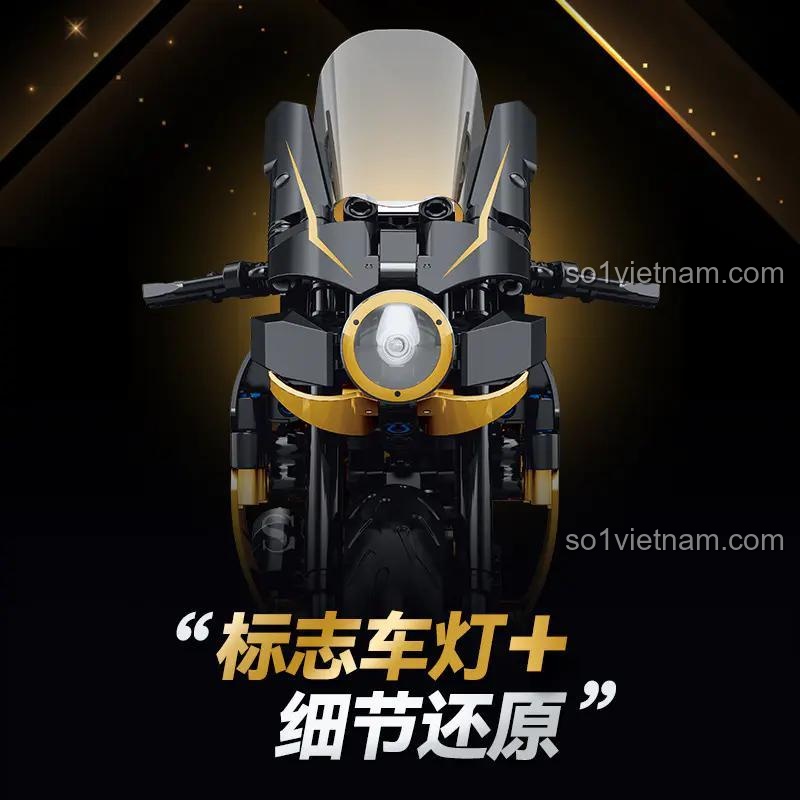 Điểm đặc biệt nhất của mô hình này là sự kết hợp giữa thiết kế tuyệt đẹp với tỉ lệ 1:8 hoành tráng và các chức năng cơ khí Technic chân thực (hệ thống xích, phuộc, tay lái). Phối màu đen-vàng cũng tạo nên một vẻ ngoài cực kỳ cao cấp và nổi bật, rất phù hợp để trưng bày.