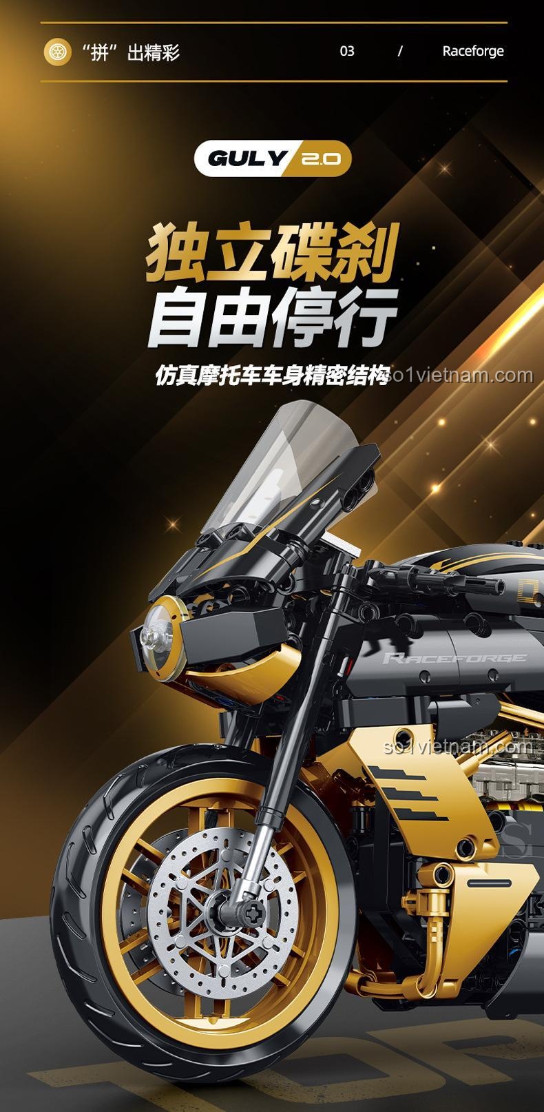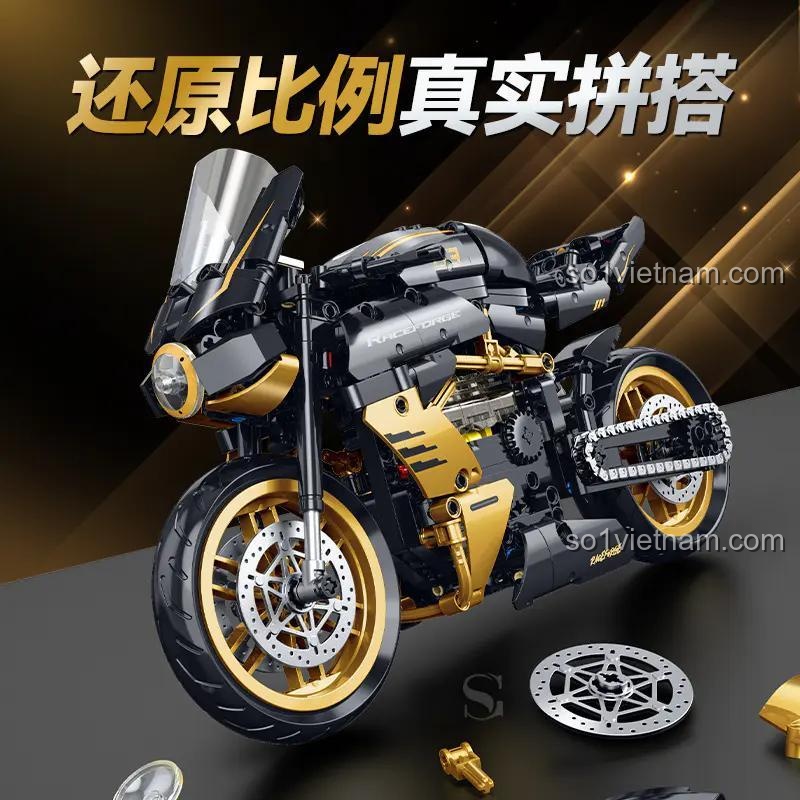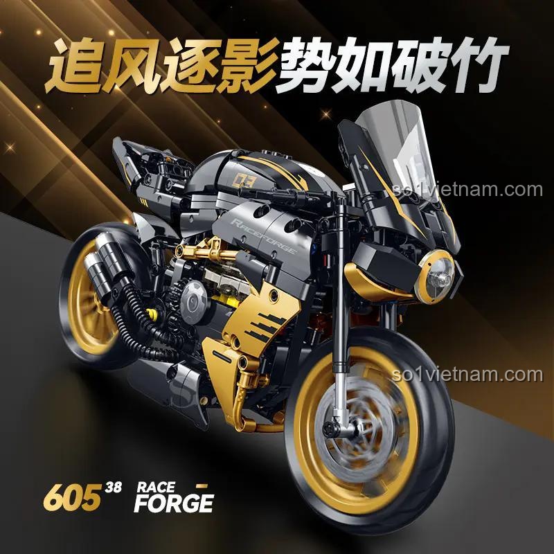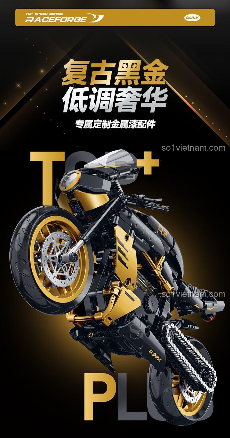 Điểm đặc biệt nhất của mô hình này là sự kết hợp giữa thiết kế tuyệt đẹp với tỉ lệ 1:8 hoành tráng và các chức năng cơ khí Technic chân thực (hệ thống xích, phuộc, tay lái). Phối màu đen-vàng cũng tạo nên một vẻ ngoài cực kỳ cao cấp và nổi bật, rất phù hợp để trưng bày.