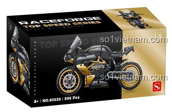 Ngay từ cái nhìn đầu tiên, Siêu mô tô Augusta 60538 đã chinh phục mọi ánh nhìn bởi vẻ ngoài cực kỳ hầm hố và sang trọng. Khoác lên mình tông màu đen huyền bí kết hợp với những điểm nhấn vàng gold đầy quyền lực, mô hình này toát lên một vẻ đẹp mạnh mẽ, vừa cổ điển lại vừa hiện đại. Với tỉ lệ vàng 1:8, mọi chi tiết đều được tái hiện một cách đáng kinh ngạc, từ bình xăng cơ bắp, khối động cơ phức tạp, hệ thống ống xả kép cho đến bộ phanh đĩa chi tiết. Kích thước sau khi hoàn thiện lên tới 32cm chiều dài, 11cm chiều rộng và 20cm chiều cao, tạo nên một mô hình trưng bày vô cùng hoành tráng và ấn tượng. Từng đường nét, từng góc cạnh đều được trau chuốt tỉ mỉ, mang lại cảm giác chân thực như đang chiêm ngưỡng một chiếc siêu mô tô thực thụ. Đây chắc chắn là một tác phẩm nghệ thuật cơ khí mà bất kỳ cậu bé nào cũng ao ước sở hữu.