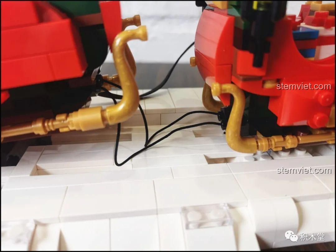 Điều làm nên sự khác biệt và ‘gây nghiện’ của bộ đồ chơi này chính là khả năng chuyển động. Được trang bị một động cơ và hộp pin (sử dụng 6 viên pin AAA), sau khi lắp ráp xong, chỉ cần một nút bấm, cả sa bàn sẽ bừng tỉnh. Bé sẽ phải trầm trồ kinh ngạc khi chứng kiến 8 chú tuần lộc nhịp nhàng nhấp nhô lên xuống, trong khi hai cỗ xe trượt tuyết nhẹ nhàng trượt tới lui trên đường ray tuyết. Cơ chế chuyển động thông minh này không chỉ tạo ra một cảnh tượng đẹp mắt mà còn giúp bé hiểu thêm về các nguyên lý cơ học cơ bản. Khoảnh khắc ông già Noel và đoàn tuần lộc ‘sống dậy’ chắc chắn sẽ là một kỷ niệm khó quên, thắp sáng trí tưởng tượng và niềm tin vào những điều kỳ diệu của bé.