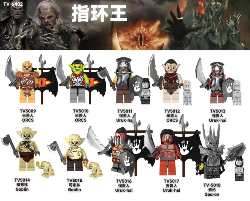 Bộ đồ chơi mô hình TV5016 này bao gồm tổng cộng 10 minifigure, tái hiện các nhân vật nổi tiếng từ Chúa Tể Những Chiếc Nhẫn như Orcs, Uruk-hai, Goblin và Sauron.