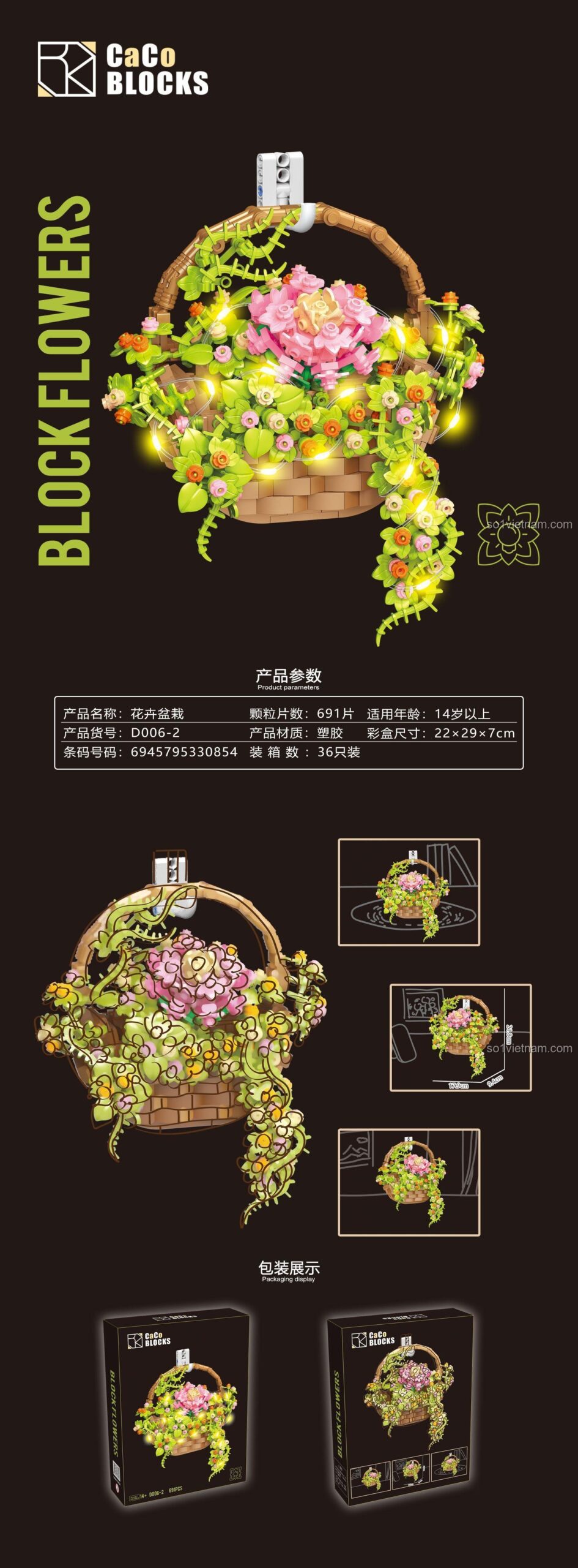 Bạn có bao giờ ước rằng vẻ đẹp của những đóa hoa tươi thắm có thể tồn tại mãi mãi, không bao giờ tàn phai? Ý tưởng về một giỏ hoa luôn rực rỡ, luôn căng tràn sức sống chính là nguồn cảm hứng để CaCo tạo ra bộ sản phẩm D006-2 này. Đây không chỉ là một món đồ chơi lắp ráp, mà là một tác phẩm nghệ thuật, một cách để bạn lưu giữ khoảnh khắc đẹp nhất của thiên nhiên. Dành cho những tâm hồn lãng mạn, yêu cái đẹp, đặc biệt là các bạn gái 14 tuổi, bộ lắp ghép này mở ra một không gian sáng tạo để bạn tự tay kiến tạo nên một góc nhỏ bình yên, một ‘khu vườn’ treo tường của riêng mình. Mỗi một mảnh ghép bạn gắn vào là một lần bạn gửi gắm tình yêu và sự trân trọng đối với vẻ đẹp vĩnh cửu, tạo nên một câu chuyện của riêng bạn, một câu chuyện không bao giờ có hồi kết.
