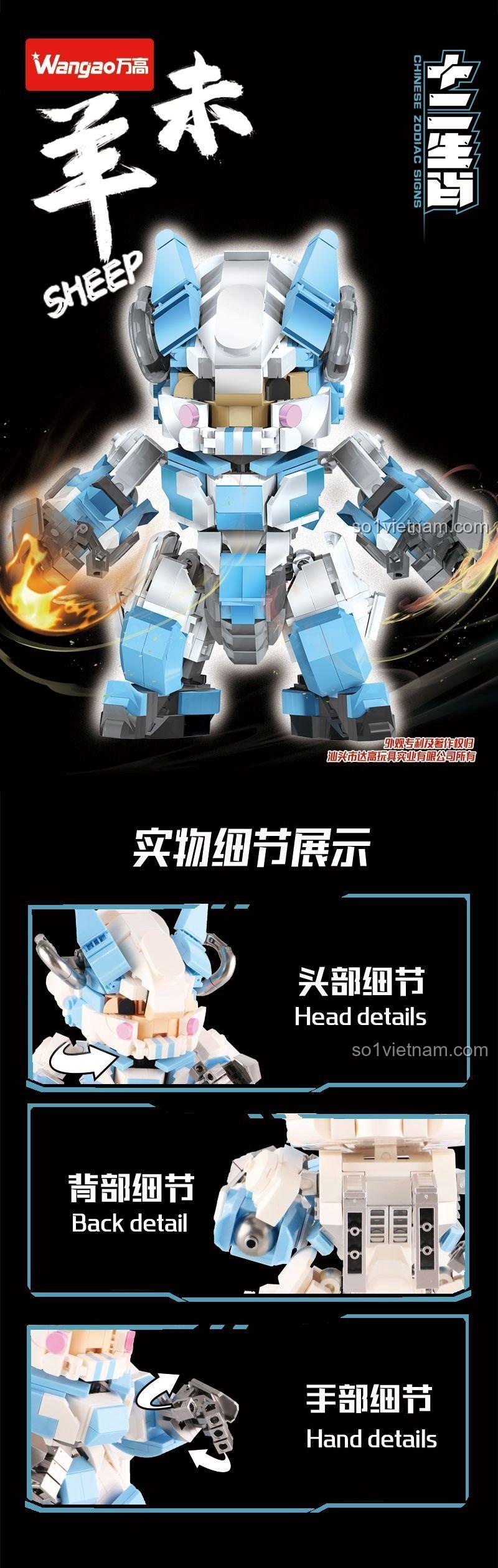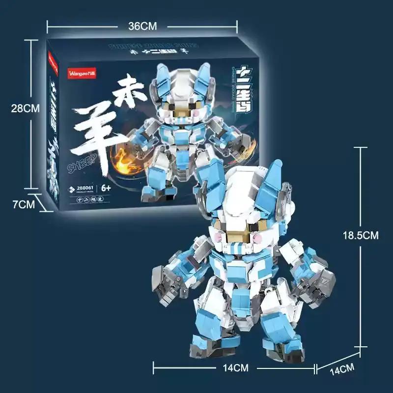 Bộ Lắp Ghép Wangao 288061 nổi bật với thiết kế lấy cảm hứng từ 12 con giáp, mang đến một phiên bản Cừu máy đầy ấn tượng. Mô hình sở hữu lớp giáp trụ mạnh mẽ, các chi tiết được gia công tỉ mỉ, sắc nét, tạo nên một vẻ ngoài hầm hố và đầy cuốn hút. Màu sắc chủ đạo là sự kết hợp hài hòa giữa xanh dương, trắng và xám, tạo cảm giác hiện đại và mạnh mẽ.