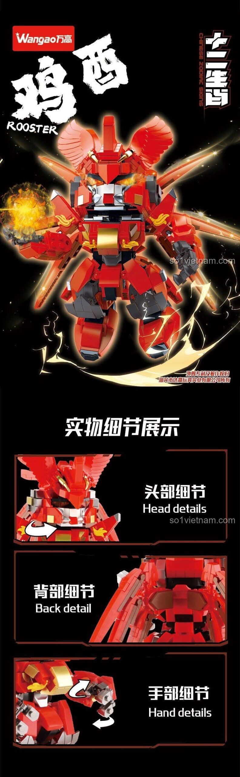 Wangao 288063 không chỉ là một bộ đồ chơi lắp ghép thông thường. Nó là sự kết hợp tinh tế giữa hình tượng Gà – một trong những con giáp mang ý nghĩa về sự chăm chỉ, dũng cảm và báo hiệu một ngày mới tốt lành – với phong cách robot chiến đấu hiện đại. Mô hình có kích thước ấn tượng cao 20cm, với chiều dài và chiều rộng khoảng 15cm, tạo nên một hình ảnh oai vệ và đầy uy lực. Tông màu chủ đạo là đỏ rực, điểm xuyết vàng và đen, tạo nên vẻ ngoài vô cùng bắt mắt và mạnh mẽ, phù hợp với sở thích của các bé trai năng động.