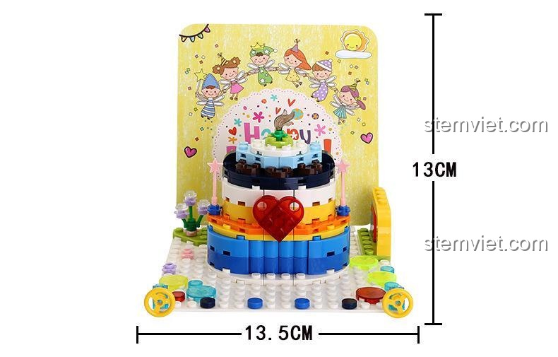 Ngay từ cái nhìn đầu tiên, mô hình đã gây ấn tượng mạnh mẽ với hình ảnh một chiếc bánh sinh nhật ba tầng rực rỡ sắc màu. Tầng dưới cùng mang màu xanh dương hy vọng, tầng giữa là màu vàng tươi vui và tầng trên cùng là màu trắng tinh khôi, điểm xuyết bởi những chi tiết màu nâu socola ngọt ngào. Mỗi tầng bánh đều được trang trí tỉ mỉ với những ‘viên kẹo’ đầy màu sắc, những ngọn nến lung linh và một trái tim màu đỏ nồng thắm ở chính giữa, biểu trưng cho tình yêu thương. Điểm đặc biệt nhất chính là tấm nền phía sau, được thiết kế như một trang thiệp mở ra với hình ảnh các cô bé, cậu bé vui vẻ dự tiệc, tạo nên một không gian sinh nhật 3D sống động. Với kích thước sau khi lắp ráp là 13.5cm x 12.9cm x 13cm, mô hình này đủ nhỏ gọn để trưng bày trên bàn học nhưng cũng đủ lớn để thể hiện trọn vẹn vẻ đẹp chi tiết.