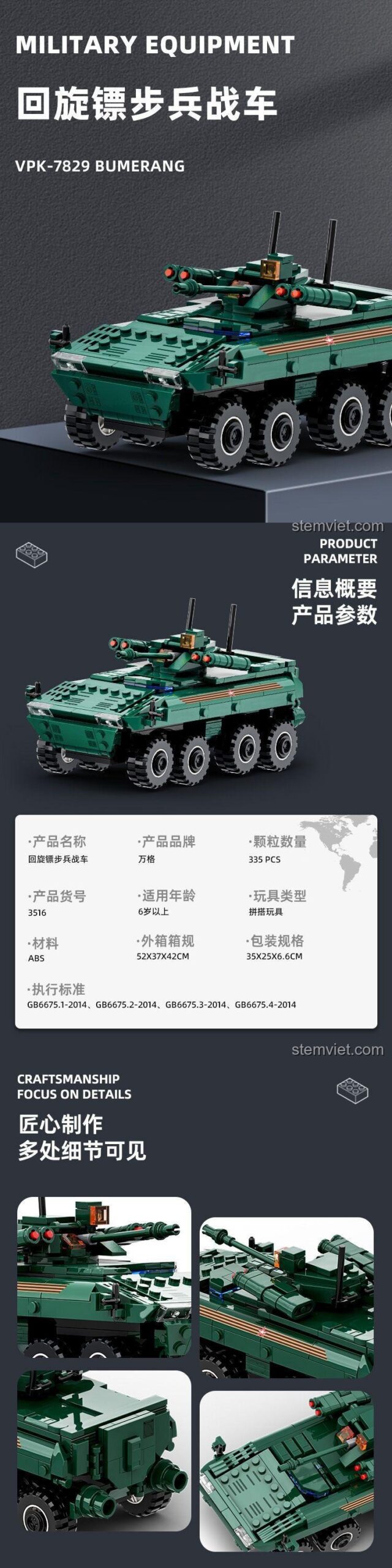 Wange 3516: Bộ lắp ghép Xe chiến đấu bộ binh Bumerang (335 mảnh) – Sức Mạnh Quân Sự