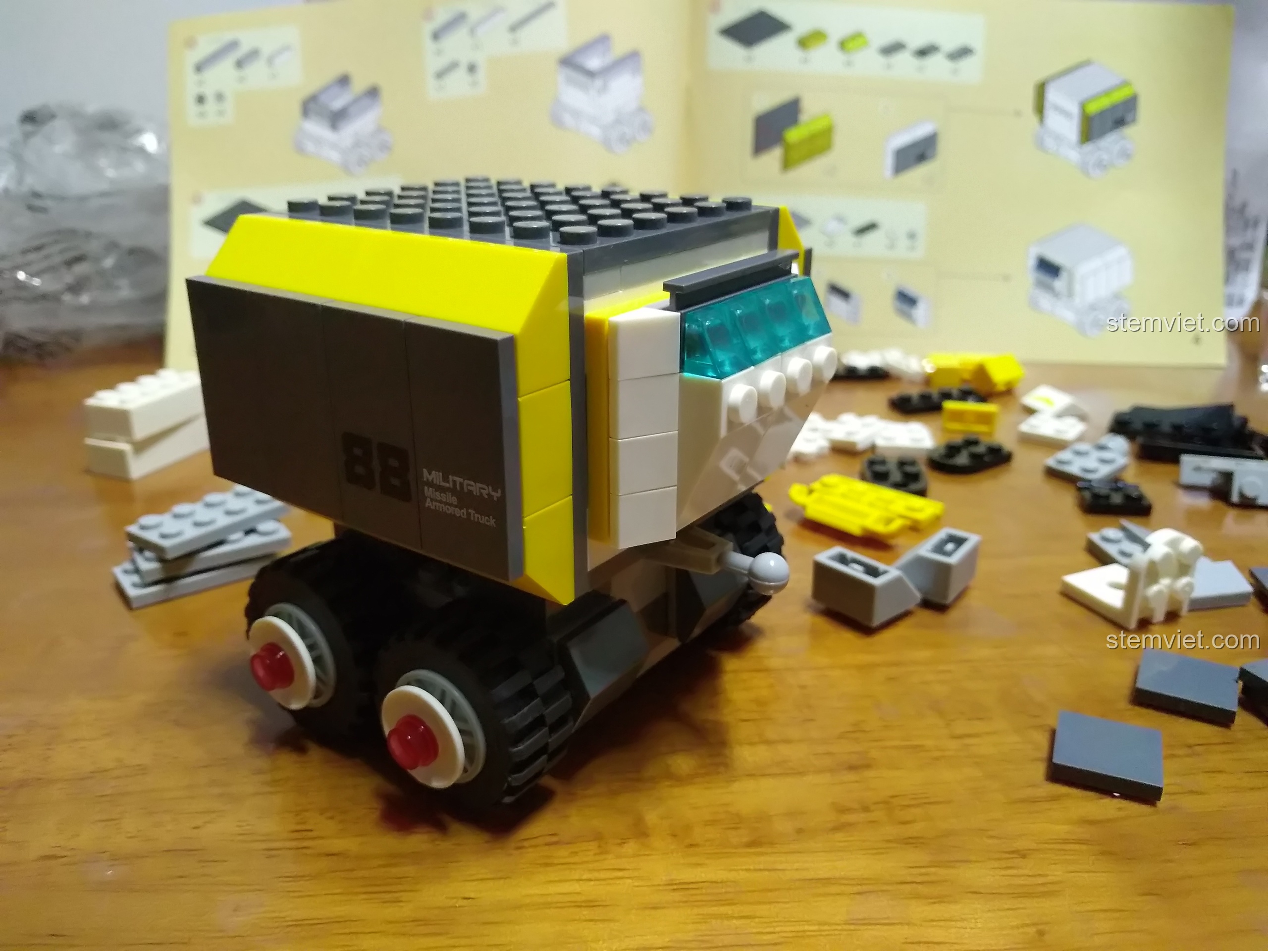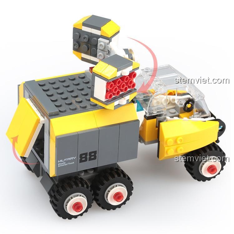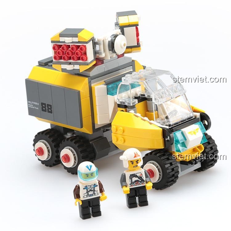 Điểm nhấn đắt giá nhất của mô hình chính là giàn phóng tên lửa đa nòng ở phía sau. Cụm vũ khí này được thiết kế vô cùng chi tiết, có khả năng xoay 360 độ và nâng lên hạ xuống, cho phép bé tái hiện những cảnh chiến đấu hoành tráng một cách sống động. Từng chi tiết nhỏ như logo ‘Military 88’, các tấm giáp hai bên hông đều được chăm chút tỉ mỉ, tạo nên một mô hình xe chiến đấu hoàn chỉnh, sẵn sàng cho mọi nhiệm vụ. Với 294 mảnh ghép, đây là một thử thách vừa đủ cho các bé trai từ 6 tuổi, giúp con rèn luyện sự kiên nhẫn và tập trung.