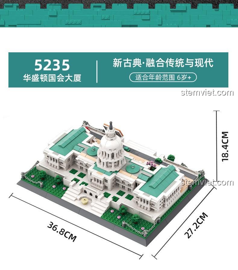 Với 1074 mảnh ghép, mô hình WANGE 5235 không chỉ là một thử thách mà còn là một tác phẩm nghệ thuật. Từng chi tiết nhỏ nhất của Điện Capitol đều được tái hiện một cách đáng kinh ngạc. Bố mẹ và bé sẽ phải trầm trồ trước vẻ đẹp của mái vòm trung tâm màu trắng tinh khôi, được tạo nên từ nhiều lớp cột tròn tinh xảo, mô phỏng hoàn hảo kiến trúc nguyên bản. Hai bên là hai cánh tòa nhà đối xứng – nơi đặt Thượng viện và Hạ viện – với mái xanh đặc trưng và hàng cột trang nghiêm. Kích thước sau khi hoàn thành lên tới 36.8 x 27.2 x 18.4 cm, biến nó thành một vật phẩm trưng bày vô cùng ấn tượng trong phòng khách hay góc học tập của bé. Màu sắc chủ đạo Trắng, Xanh lá và Xám được phối hợp hài hòa, mang lại vẻ trang nhã và chân thực, như thể đang chiêm ngưỡng một Điện Capitol thu nhỏ ngay tại nhà.