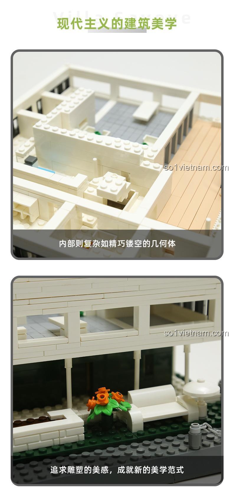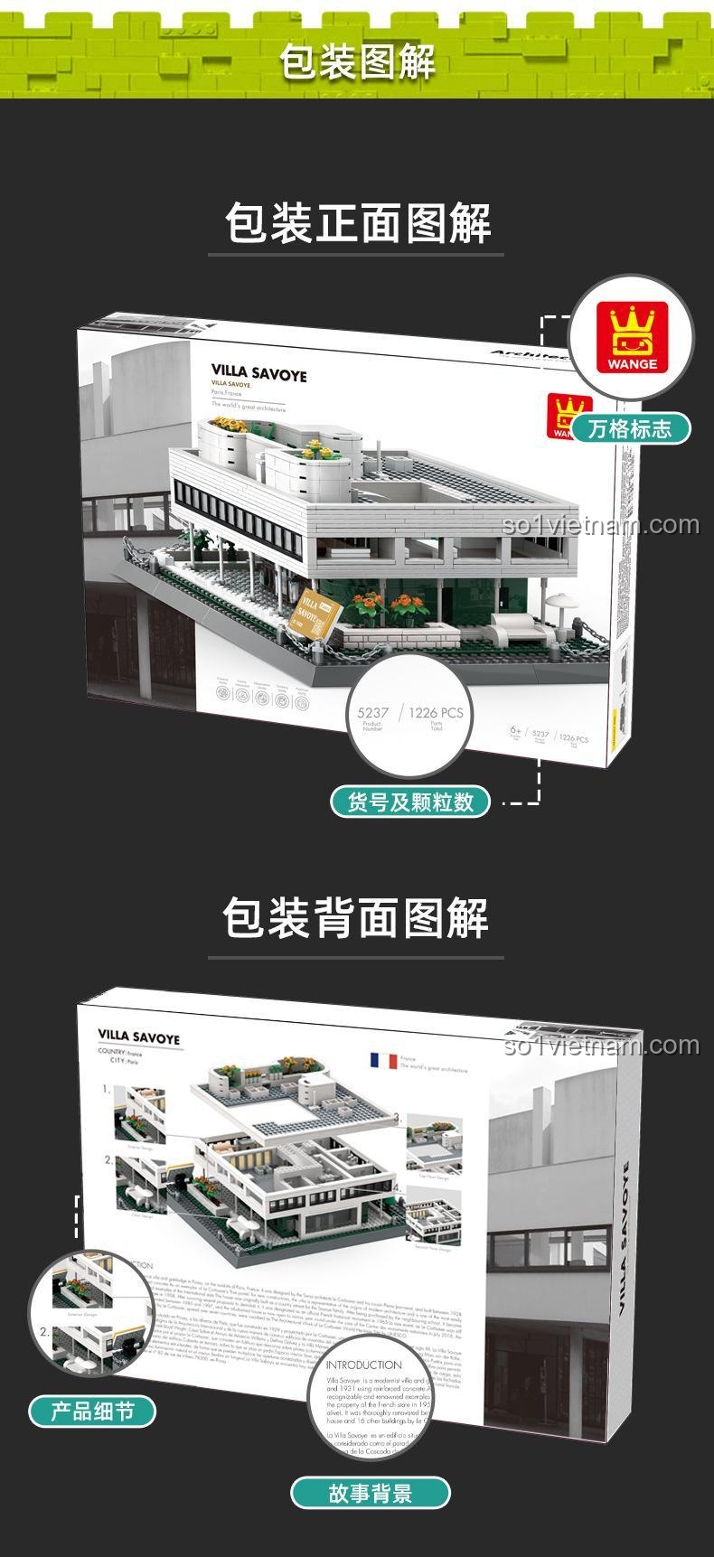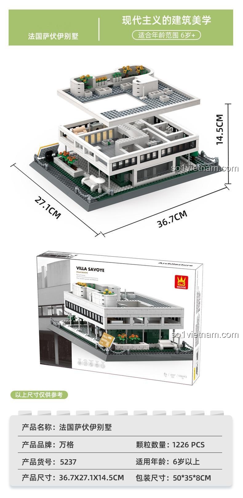 Bộ lắp ghép WANGE 5237 được thiết kế với sự chú trọng đến từng chi tiết nhỏ nhất, mô phỏng chính xác kiến trúc độc đáo của Biệt thự Savoye. Với gam màu trắng chủ đạo, các đường nét vuông vắn, ban công cong mềm mại và khu vườn trên mái xanh tươi, mô hình mang đến vẻ đẹp thanh lịch, tối giản và đầy cuốn hút. Các tầng có thể tháo rời giúp bạn dễ dàng chiêm ngưỡng không gian bên trong, từ phòng khách thoáng đãng đến các phòng ngủ ấm cúng. Kích thước mô hình sau khi hoàn thành (36.7 x 27.1 x 14.5 cm) đủ lớn để trở thành điểm nhấn ấn tượng trên bàn làm việc hay kệ trưng bày của bạn.