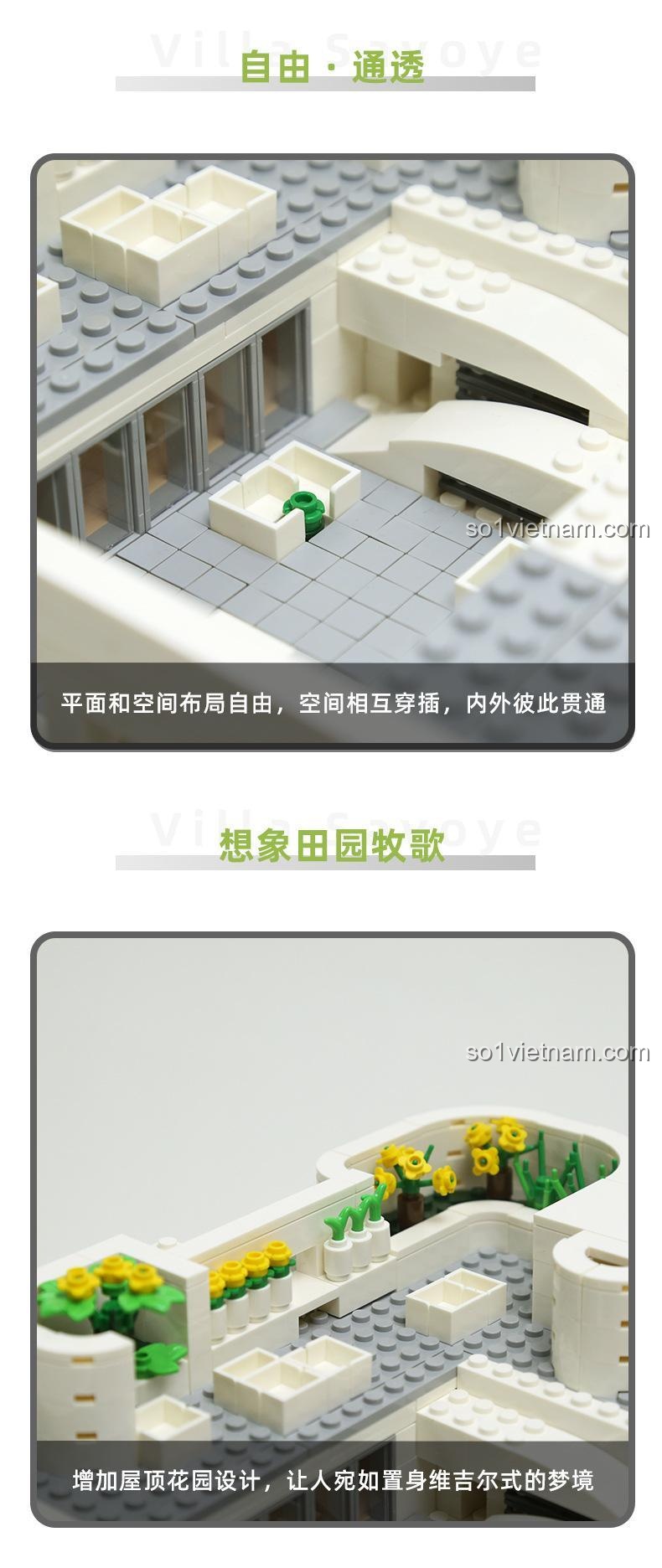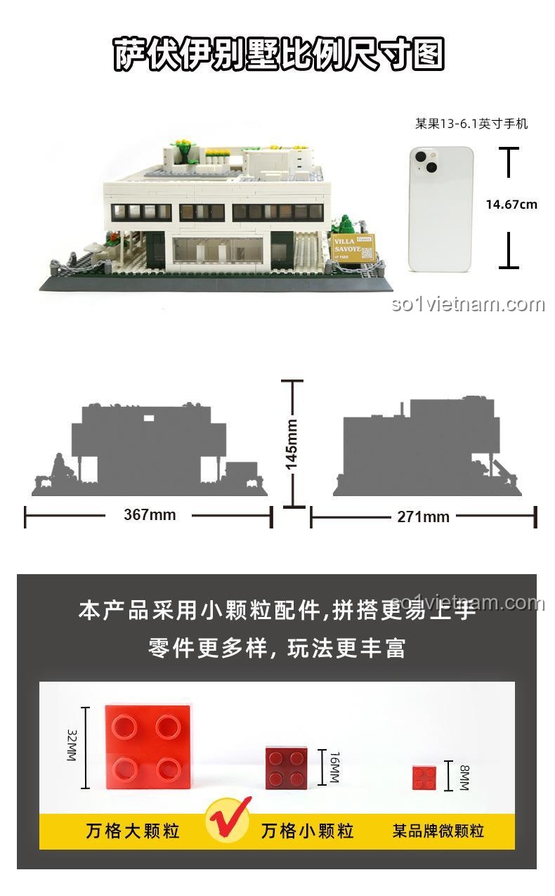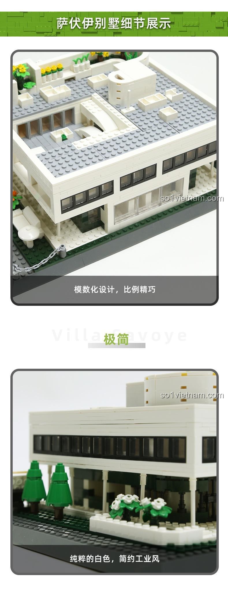 Bộ lắp ghép WANGE 5237 được thiết kế với sự chú trọng đến từng chi tiết nhỏ nhất, mô phỏng chính xác kiến trúc độc đáo của Biệt thự Savoye. Với gam màu trắng chủ đạo, các đường nét vuông vắn, ban công cong mềm mại và khu vườn trên mái xanh tươi, mô hình mang đến vẻ đẹp thanh lịch, tối giản và đầy cuốn hút. Các tầng có thể tháo rời giúp bạn dễ dàng chiêm ngưỡng không gian bên trong, từ phòng khách thoáng đãng đến các phòng ngủ ấm cúng. Kích thước mô hình sau khi hoàn thành (36.7 x 27.1 x 14.5 cm) đủ lớn để trở thành điểm nhấn ấn tượng trên bàn làm việc hay kệ trưng bày của bạn.
