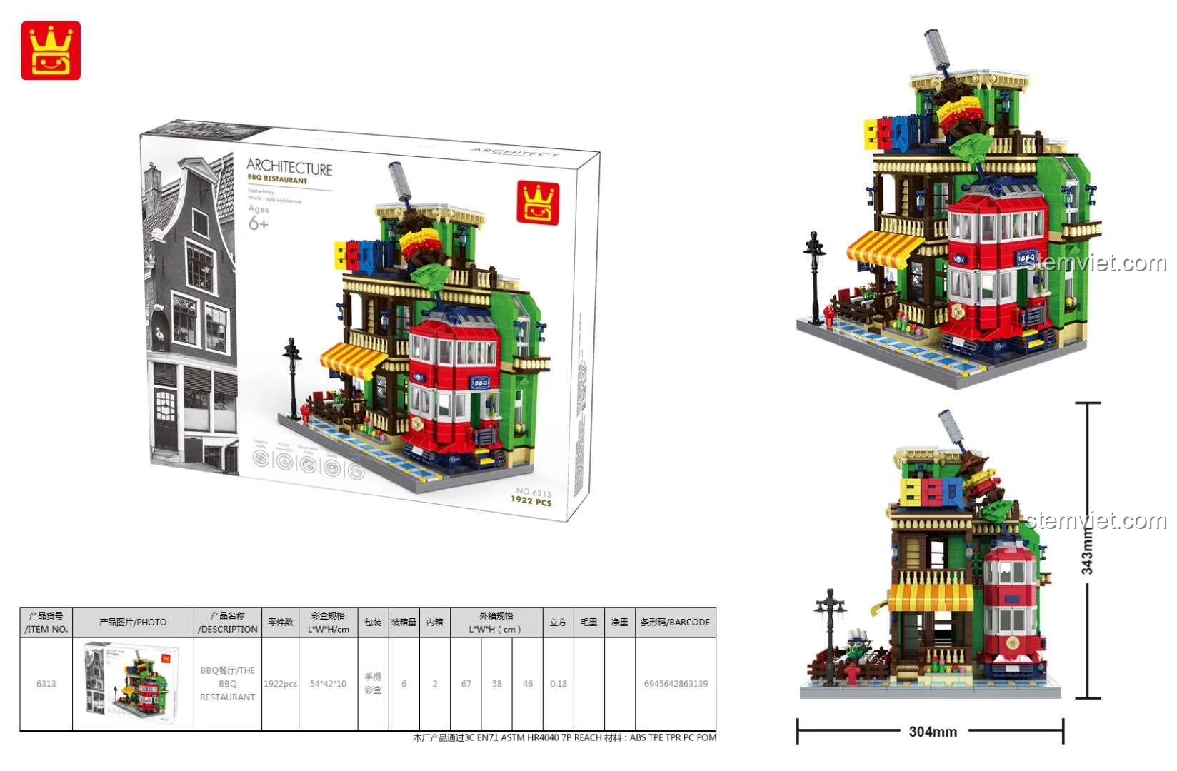 Mẹ có biết không, những góc phố ẩm thực nhộn nhịp, thơm lừng mùi đồ nướng luôn có một sức hấp dẫn kỳ lạ với các bạn nhỏ. Đó là nơi của những câu chuyện, của sự sum vầy và những món ăn ngon khó cưỡng. Lấy cảm hứng từ không gian đầy sức sống đó, đồ chơi xếp hình WANGE đã cho ra đời bộ mô hình Nhà hàng BBQ 6313, một tác phẩm kiến trúc thu nhỏ độc đáo, mời gọi bé và cả gia đình cùng nhau xây dựng và khám phá. Đây không chỉ là một món đồ chơi, mà là cả một câu chuyện về niềm vui kinh doanh, về sự sáng tạo trong kiến trúc và về những bữa tiệc BBQ ấm cúng. Với bộ lắp ghép này, bé 6 tuổi nhà mình sẽ được hóa thân thành một kiến trúc sư tài ba, một ông/bà chủ quán nướng thân thiện, tự tay tạo nên một góc phố ẩm thực của riêng mình, một nơi mà trí tưởng tượng và niềm vui không bao giờ tắt.