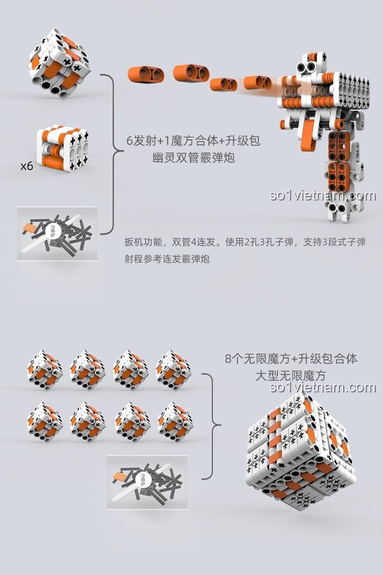 Khả năng lắp ráp đa dạng là một yếu tố quan trọng khác làm nên sức hút của Infinite Cube. Bé không chỉ có thể lắp ráp thành một khẩu súng phóng lựu mini theo hướng dẫn, mà còn có thể tự do sáng tạo, kết hợp các khối Infinite Cube để tạo ra những mô hình hoàn toàn mới theo ý tưởng của mình. Từ việc kết hợp 2 bộ, 3 bộ, thậm chí là 6 bộ Infinite Cube, bé có thể xây dựng nên những khẩu súng phóng lựu lớn hơn, mạnh mẽ hơn, hoặc biến hóa thành các loại vũ khí, phương tiện khác.