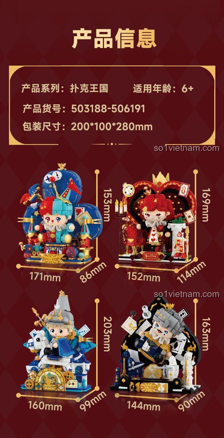Bộ lắp ghép Wekki 503188-506191 nổi bật với thiết kế độc đáo, lấy cảm hứng trực tiếp từ thế giới bài Poker. Mô hình Chú Hề trung tâm với bộ trang phục sặc sỡ, mái tóc hai màu đỏ-xanh và khuôn mặt biểu cảm đáng yêu sẽ là điểm nhấn thu hút mọi ánh nhìn. Các chi tiết trang trí xung quanh như lá bài, quả cầu, và các yếu tố mang đậm không khí lễ hội tạo nên một bức tranh sống động, đầy màu sắc. Màu sắc chủ đạo xanh dương, đỏ, trắng và vàng được phối hợp hài hòa, tạo nên một tổng thể bắt mắt và ấn tượng.