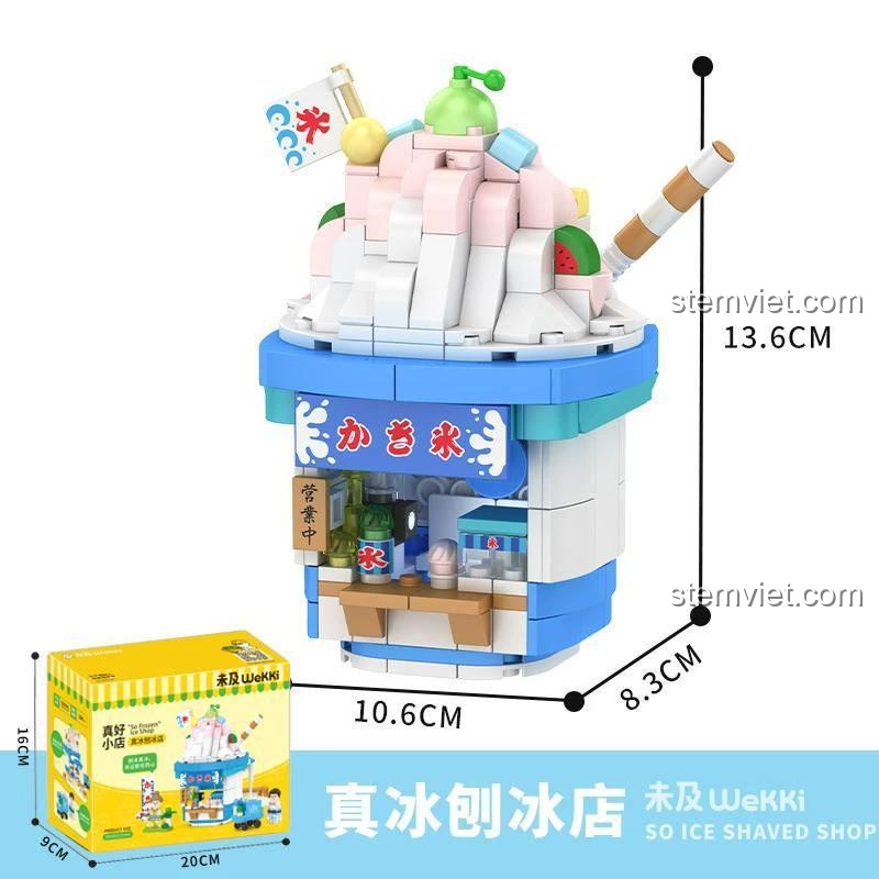 Wekki 506041 không chỉ gây ấn tượng bởi câu chuyện mà còn bởi thiết kế vô cùng sáng tạo và chi tiết. Mô hình được thiết kế theo hình dáng một ly bào đá khổng lồ, với phần mái nhà là lớp đá bào trắng muốt điểm xuyết những viên kẹo màu sắc rực rỡ. Màu sắc chủ đạo xanh dương, trắng và hồng tạo nên một tổng thể tươi mát, ngọt ngào, đúng chất của một tiệm giải khát mùa hè. Với kích thước mô hình 10.6cm (dài) x 8.3cm (rộng) x 13.6cm (cao), bộ đồ chơi này vừa vặn để bé trưng bày hoặc mang theo. Đặc biệt, thiết kế mở/đóng linh hoạt cho phép bé dễ dàng khám phá không gian bên trong, từ quầy pha chế đến khu vực khách hàng. Mỗi chi tiết nhỏ, từ máy bào đá, ly đựng bào đá đến biển hiệu và bàn ghế ngoài trời, đều được tái hiện một cách tỉ mỉ, mang đến trải nghiệm chân thực nhất cho bé khi chơi với bộ lắp ghép 06041 này.