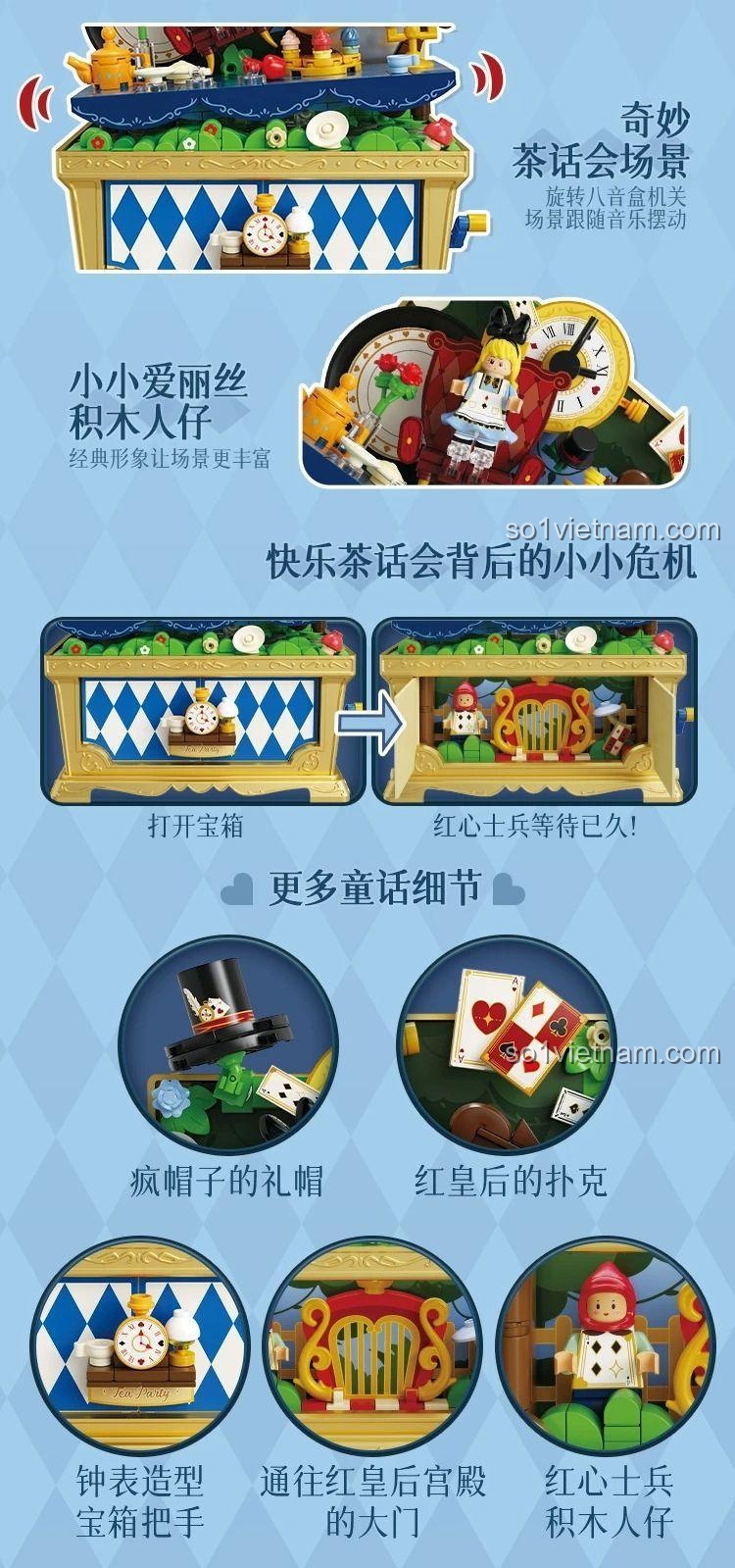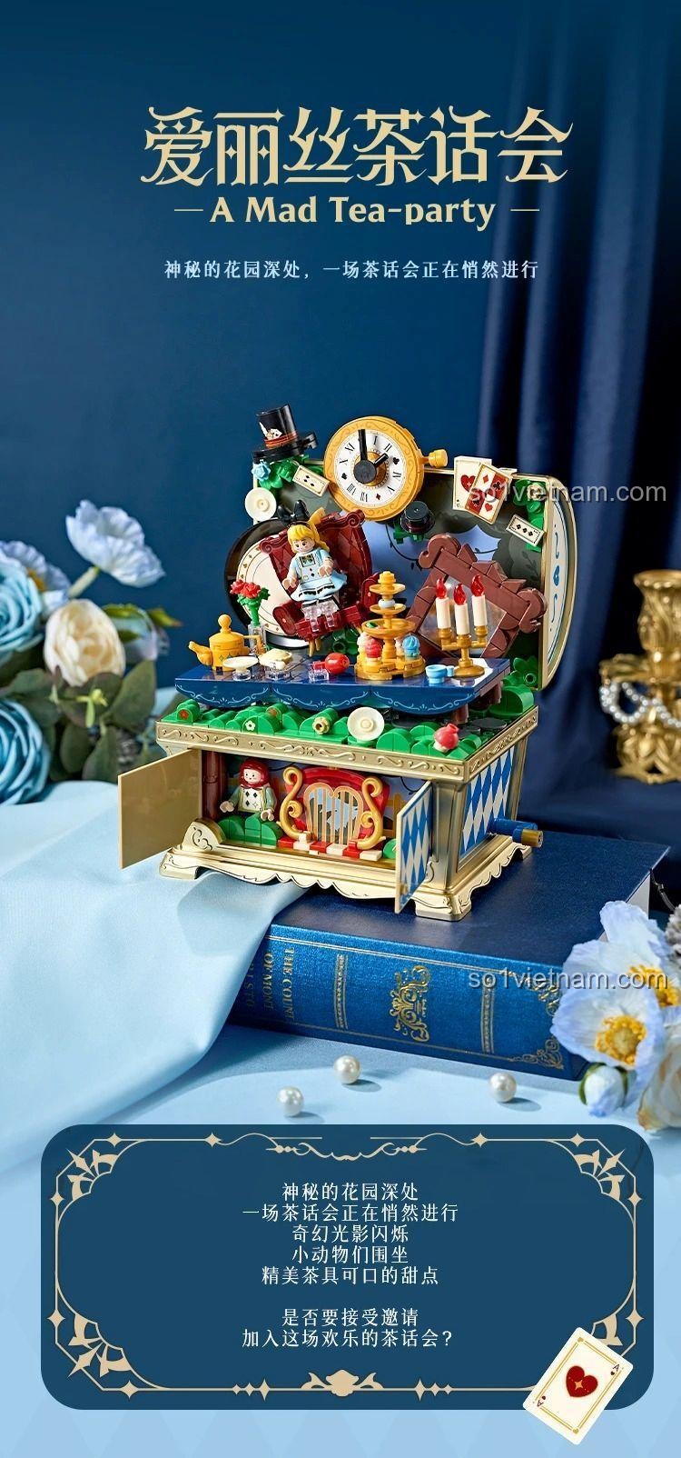 Điều làm nên sự khác biệt và mê hoặc của Hộp nhạc cổ tích 506192 chính là tính năng hộp nhạc cơ học tích hợp. Không cần pin, không cần điện, chỉ cần nhẹ nhàng lên dây cót ở bên hông, một giai điệu du dương, trong trẻo sẽ vang lên, đưa bé lạc vào không gian cổ tích thực sự. Nhưng điều kỳ diệu không dừng lại ở đó! Khi âm nhạc cất lên, toàn bộ sân khấu tiệc trà phía trên sẽ bắt đầu chuyển động một cách nhịp nhàng. Alice sẽ lắc lư, các chi tiết trang trí sẽ xoay tròn, tạo nên một vũ điệu sống động và đầy cuốn hút. Tính năng độc đáo này không chỉ mang lại sự thích thú cho bé khi chơi mà còn biến mô hình thành một vật trang trí có hồn, một cỗ máy thời gian nhỏ xinh kể lại câu chuyện thần tiên mỗi khi được đánh thức. Đây là sự kết hợp hoàn hảo giữa đồ chơi lắp ráp tĩnh và một tác phẩm nghệ thuật cơ khí động, chắc chắn sẽ khiến mọi cô bé phải trầm trồ.