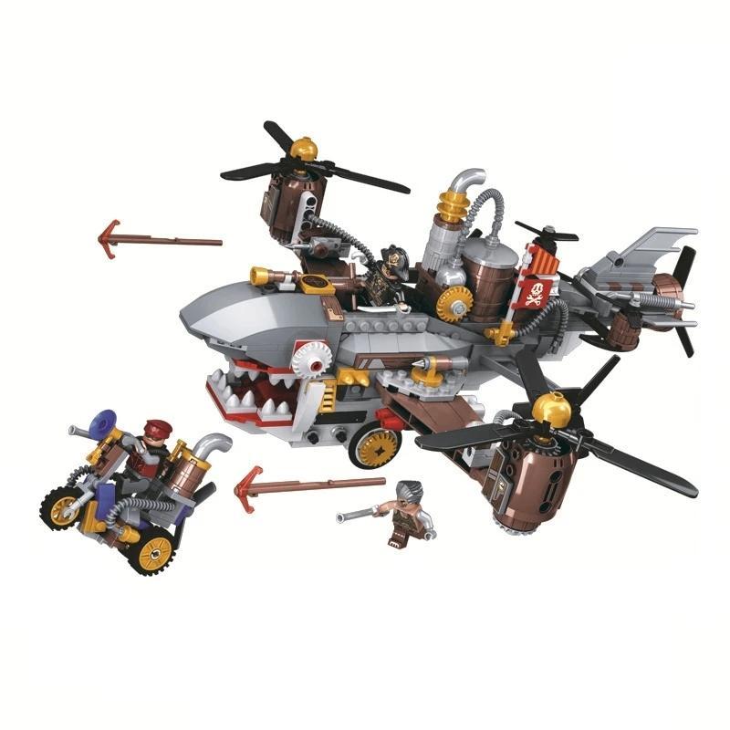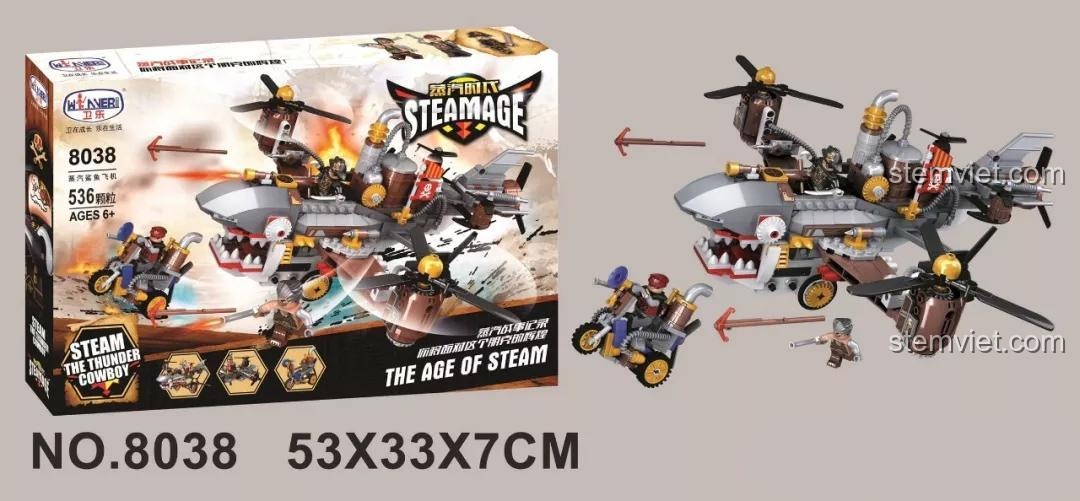 Máy bay cá mập hơi nước Winner 8038 nổi bật với thiết kế Steampunk độc đáo và khả năng lắp ráp 2 trong 1 (máy bay và mô tô). Máy bay có các cánh quạt xoay được, và bộ đồ chơi đi kèm 3 minifigures nhân vật để tăng cường trải nghiệm nhập vai.
