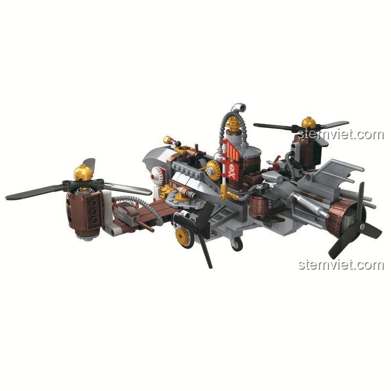 Chiếc máy bay cá mập được trang bị các cánh quạt lớn, có thể xoay linh hoạt, tạo cảm giác chân thực như một phi cơ thực thụ đang cất cánh. Các chi tiết ống khói, bánh răng được thiết kế tinh xảo, dù không có động cơ điện tử nhưng vẫn gợi lên sự mạnh mẽ của cỗ máy hơi nước. Đặc biệt, bộ đồ chơi còn đi kèm 3 minifigures nhân vật với trang phục và phụ kiện theo phong cách steampunk, như súng và kiếm. Những nhân vật này không chỉ làm tăng tính tương tác mà còn là nguồn cảm hứng để bé sáng tạo nên những câu chuyện phiêu lưu, nhập vai đầy kịch tính. Bé trai 6 tuổi sẽ thỏa sức tưởng tượng mình là một phi công dũng cảm hay một nhà thám hiểm tài ba trong thế giới Steampunk đầy bí ẩn.