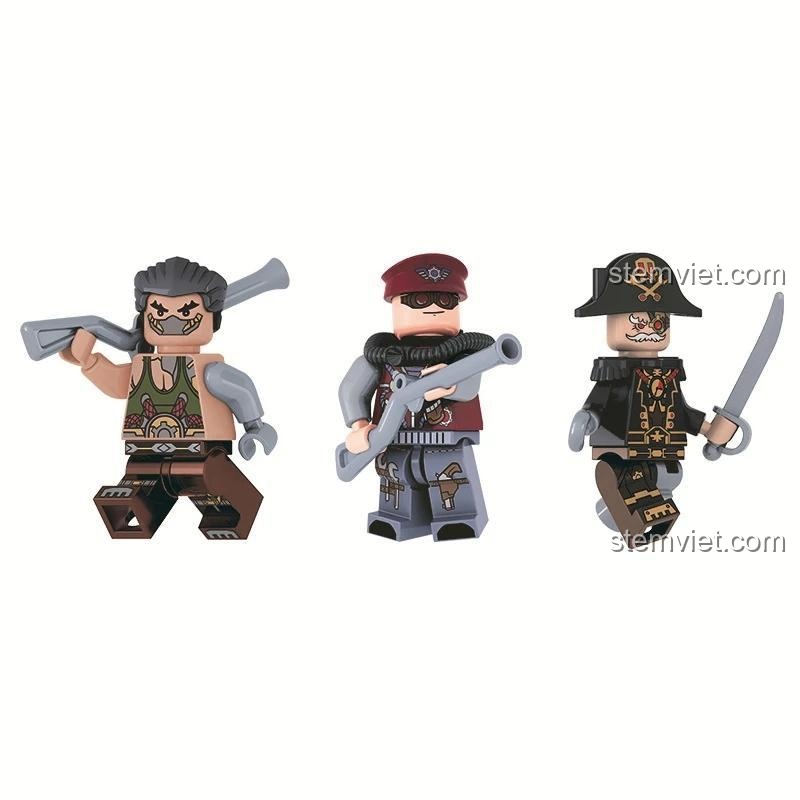 Bộ đồ chơi mô hình JEMLOU 8038 đi kèm 3 minifigures nhân vật với trang phục và phụ kiện theo phong cách steampunk, giúp bé tạo ra những câu chuyện phiêu lưu đầy kịch tính.