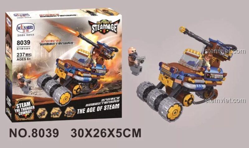 Chào các mẹ, có phải mẹ đang tìm kiếm một món đồ chơi vừa độc đáo, vừa kích thích trí tuệ cho cậu con trai 6 tuổi của mình không? Hãy tạm quên đi những mô hình ô tô, robot thông thường. Hôm nay, Kho đồ chơi trẻ em xin giới thiệu một thế giới hoàn toàn mới, nơi máy móc chạy bằng hơi nước, bánh răng và đồng thau ngự trị – thế giới Steampunk. Bộ đồ chơi Winner 8039 Xe Chiến Mã Hơi Nước chính là tấm vé mời hoàn hảo đưa bé bước vào cuộc phiêu lưu kỳ thú này. Lấy cảm hứng từ dòng sản phẩm ‘SteamAge’ (Kỷ Nguyên Hơi Nước), bộ lắp ráp này không chỉ là những mảnh ghép, mà là cả một câu chuyện về những cao bồi dũng cảm, những cỗ máy phi thường chiến đấu trong một thế giới viễn tưởng đầy mê hoặc. Bé sẽ được gặp gỡ hai nhân vật đặc biệt: một chiến binh râu rậm dày dạn kinh nghiệm và một ‘Cao bồi Sấm sét’ nhanh nhẹn, sẵn sàng cùng bé chinh phục mọi thử thách.