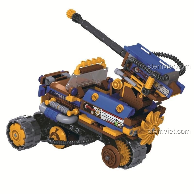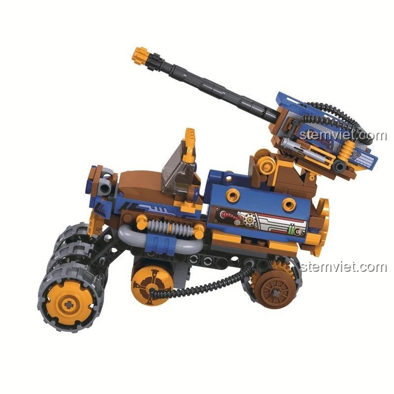 Ngay từ cái nhìn đầu tiên, Xe Chiến Mã Hơi Nước đã gây ấn tượng mạnh mẽ bởi thiết kế không thể nhầm lẫn của phong cách Steampunk. Từng chi tiết đều toát lên vẻ cổ điển pha lẫn công nghệ viễn tưởng. Sự kết hợp giữa các gam màu chủ đạo Nâu, Xanh dương, Xám và Vàng tạo nên một tổng thể hài hòa, vừa mạnh mẽ, vừa bí ẩn. Thân xe được trang trí bằng các họa tiết bánh răng, ống dẫn hơi nước và đồng hồ áp suất, gợi lên hình ảnh một cỗ máy phức tạp đang hoạt động. Điểm nhấn đặc biệt là hệ thống bánh xe địa hình hầm hố, với 4 bánh trước và 2 bánh xích phía sau, cho phép cỗ xe vượt qua mọi địa hình hiểm trở trong trí tưởng tượng của bé. Phía trên là một khẩu pháo hơi nước khổng lồ, biểu tượng sức mạnh của cỗ xe. Mọi chi tiết, từ kính chắn gió, ống xả, cho đến các tấm giáp, đều được chăm chút tỉ mỉ, tạo nên một mô hình không chỉ để chơi mà còn là một vật trưng bày cực ‘chất’.