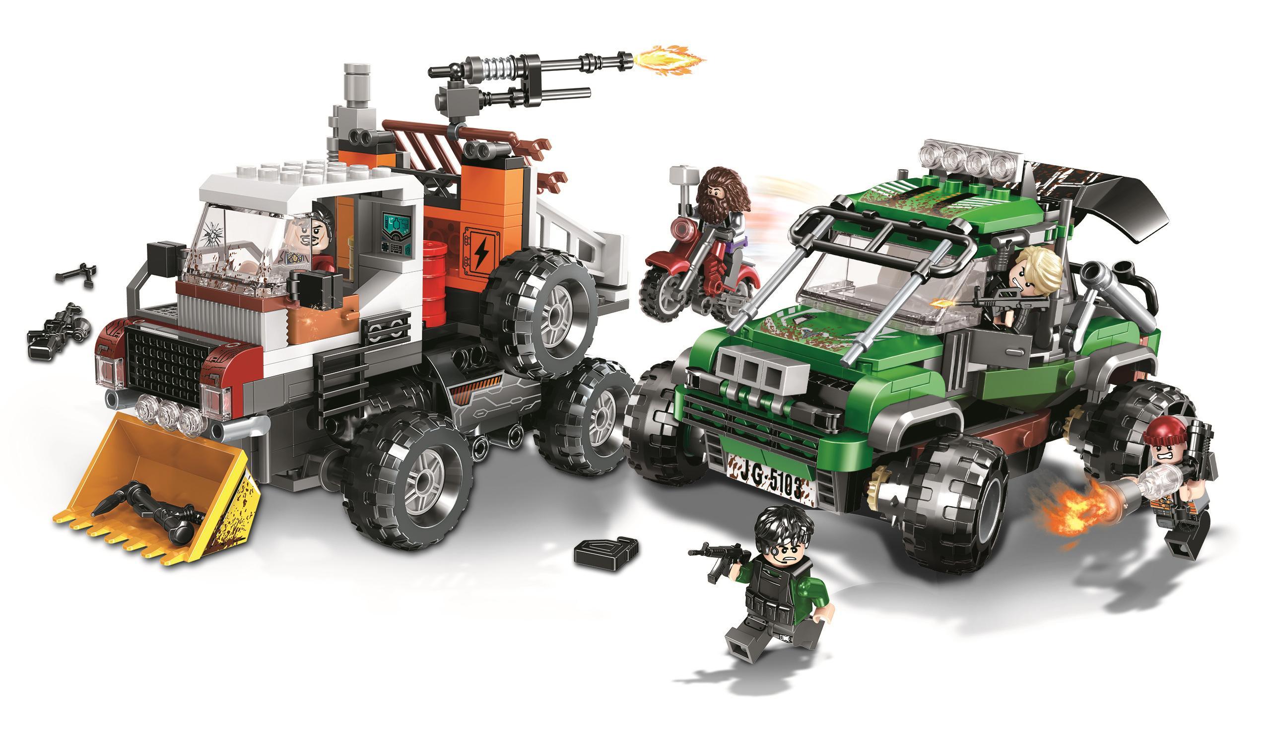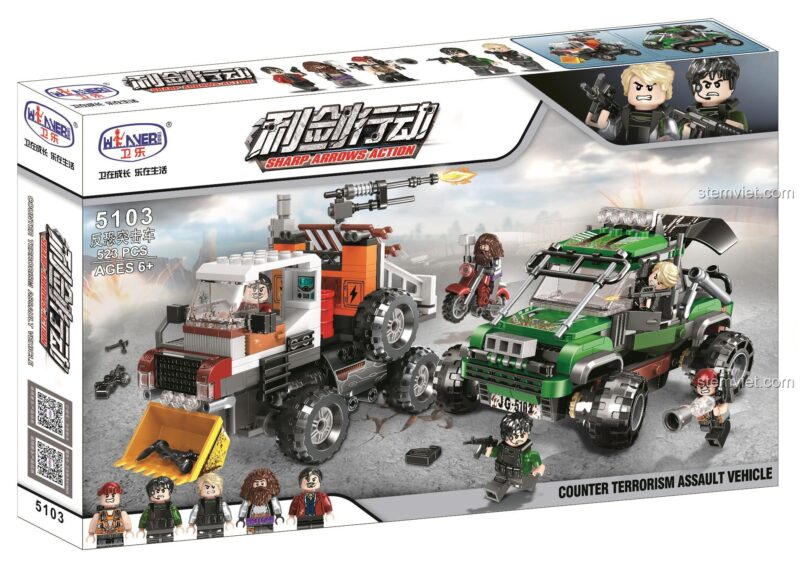 Bộ lắp ráp Winner JEMLOU 5103 Xe Tấn Công Chống Khủng Bố gây ấn tượng mạnh với thiết kế chi tiết và chân thực. Với 523 mảnh ghép, bộ đồ chơi lắp ghép này tái hiện hoàn hảo hai mẫu xe chiến đấu đặc nhiệm: một chiếc xe địa hình quân sự hầm hố với lưỡi ủi phía trước và một chiếc xe tấn công chống khủng bố cơ động. Màu sắc chủ đạo là xanh lá, trắng, cam và đen, tạo nên vẻ ngoài mạnh mẽ, đúng chất quân sự. Mỗi chiếc xe đều được trang bị đầy đủ vũ khí và phụ kiện như súng, xẻng, búa, mã tấu, cùng với 6 minifigures đặc nhiệm với trang phục và tư thế sẵn sàng chiến đấu. Từng chi tiết nhỏ, từ đèn pha, lốp xe gai góc đến các bộ phận cơ khí, đều được gia công tỉ mỉ, mang lại độ chính xác cao. Bé sẽ được chiêm ngưỡng và tự tay lắp ráp những chiếc xe với thiết kế tinh xảo, giúp bé phát triển khả năng quan sát và cảm nhận thẩm mỹ. Đây thực sự là một bộ đồ chơi mô hình đáng giá cho những ai yêu thích chủ đề quân sự và hành động.