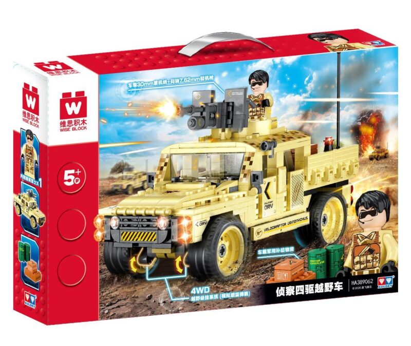 Ngay từ cái nhìn đầu tiên, **đồ chơi lắp ráp HA389062** đã gây ấn tượng mạnh mẽ với thiết kế chân thực và màu sắc chủ đạo là vàng cát, gợi nhớ đến những chiếc xe quân sự thực thụ trên chiến trường. Từng mảnh ghép được gia công tỉ mỉ, tạo nên một mô hình xe Jeep trinh sát với đầy đủ các chi tiết đặc trưng: từ lưới tản nhiệt hầm hố, đèn pha sắc nét, đến bộ lốp gai lớn sẵn sàng vượt mọi chướng ngại vật. Kích thước mô hình được thiết kế cân đối, vừa vặn để bé dễ dàng cầm nắm và điều khiển.