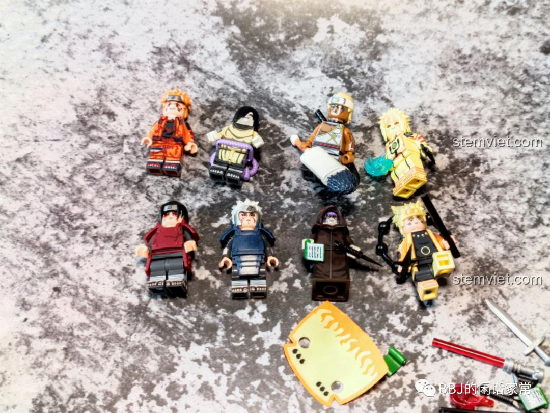 Bộ 8 minifigure Naruto này không chỉ để trưng bày mà còn mở ra vô vàn khả năng sáng tạo. Mỗi nhân vật đi kèm với vũ khí và phụ kiện đặc trưng: kunai của Minato, kiếm Kusanagi của Orochimaru, thanh Samehada của Killer Bee, và Cầu Đạo Ngọc của Naruto. Những phụ kiện này không chỉ làm tăng độ chân thực mà còn là nguồn cảm hứng để bạn tái hiện lại những nhẫn thuật và trận đấu đỉnh cao. Bạn có thể dựng lại cảnh đối đầu giữa hai anh em Hashirama và Tobirama, cuộc chiến của Minato chống lại Cửu Vĩ, hay khoảnh khắc Naruto đạt đến sức mạnh tối thượng. Việc sở hữu trọn bộ 8 nhân vật quan trọng trong cốt truyện Naruto Shippuden khiến đây trở thành một set đồ chơi có giá trị sưu tầm cao, một ‘must-have’ item trong bộ sưu tập của bất kỳ fan Naruto nào.