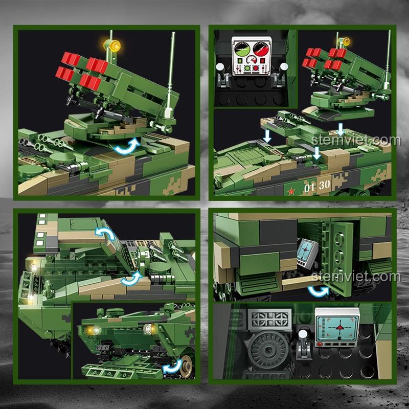Mỗi Xe Tăng Thế Giới WOMA C0130 đều được chăm chút đến từng chi tiết nhỏ. Từ hệ thống bánh xích mạnh mẽ, tháp pháo xoay linh hoạt, cho đến bệ phóng tên lửa có thể nâng hạ, tất cả đều được mô phỏng chính xác. Đặc biệt, mô hình còn đi kèm 2 minifigure lính: một lính tăng và một lính bộ binh, với trang phục và vũ khí đầy đủ như súng trường và tên lửa chống tăng. Những chi tiết này không chỉ tăng tính thẩm mỹ mà còn mở ra vô vàn kịch bản chơi nhập vai hấp dẫn.