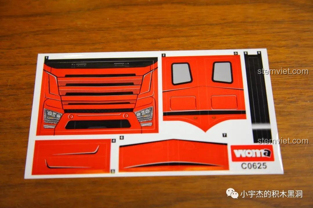 Ngay từ cái nhìn đầu tiên, mô hình WOMA C0625 đã gây ấn tượng mạnh mẽ với sự kết hợp màu sắc đầy cá tính giữa sắc đỏ rực rỡ và màu đen mạnh mẽ. Từng đường nét của xe được chăm chút tỉ mỉ, tái hiện một cách chân thực và sống động hình ảnh của một chiếc xe đầu kéo hiện đại. Với kích thước sau khi hoàn thiện lên tới 27.5 x 11.1 x 14.5 cm, đây là một mô hình có kích thước đáng kể, đủ để bé cảm nhận được sự hoành tráng của nó. Cabin được thiết kế chi tiết với nội thất bên trong, kính chắn gió trong suốt có in hình gạt nước, gương chiếu hậu, và hệ thống đèn. Đặc biệt, bộ decal đi kèm sẽ giúp bé hoàn thiện vẻ ngoài của chiếc xe, từ lưới tản nhiệt, logo cho đến các họa tiết trang trí, biến nó thành một tác phẩm nghệ thuật thực sự.