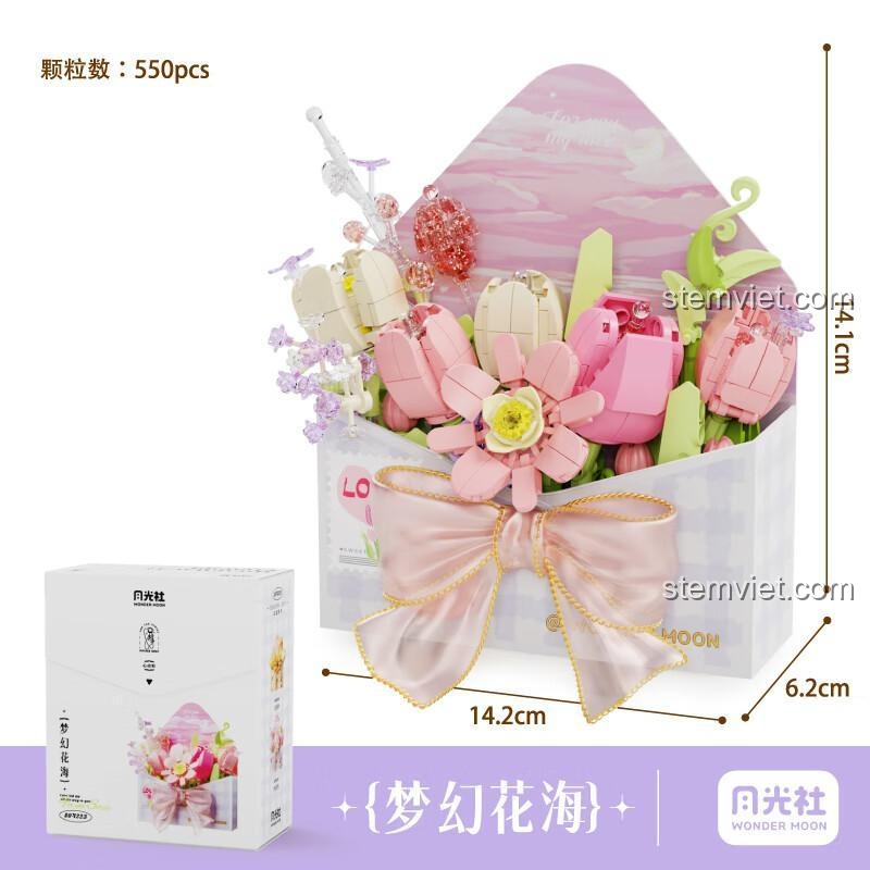 Vẻ đẹp của đồ chơi mô hình Wonder Moon 804223 nằm ở sự kết hợp hài hòa giữa ý tưởng và thiết kế. Toàn bộ ‘biển hoa’ được đặt trong một chiếc phong bì thư cách điệu, với tông màu hồng pastel và tím лаванда chủ đạo, gợi lên cảm giác ngọt ngào, mộng mơ. Bên trong là một vườn hoa rực rỡ với những bông tulip căng tràn sức sống, xen kẽ là những chùm hoa baby trắng muốt, hoa anh túc duyên dáng và hoa ren tinh khôi. Mỗi bông hoa, mỗi chiếc lá đều được chế tác tỉ mỉ từ những mảnh ghép mini, tạo nên một tổng thể sống động và chi tiết đến bất ngờ. Với kích thước nhỏ gọn 14.2 x 6.2 x 14.1 cm, mô hình Thư tình hoa nở Wonder Moon dễ dàng trở thành điểm nhấn xinh xắn trên bàn học, kệ sách hay bàn làm việc, mỗi ngày đều nhắc nhở về một thông điệp yêu thương ngọt ngào.
