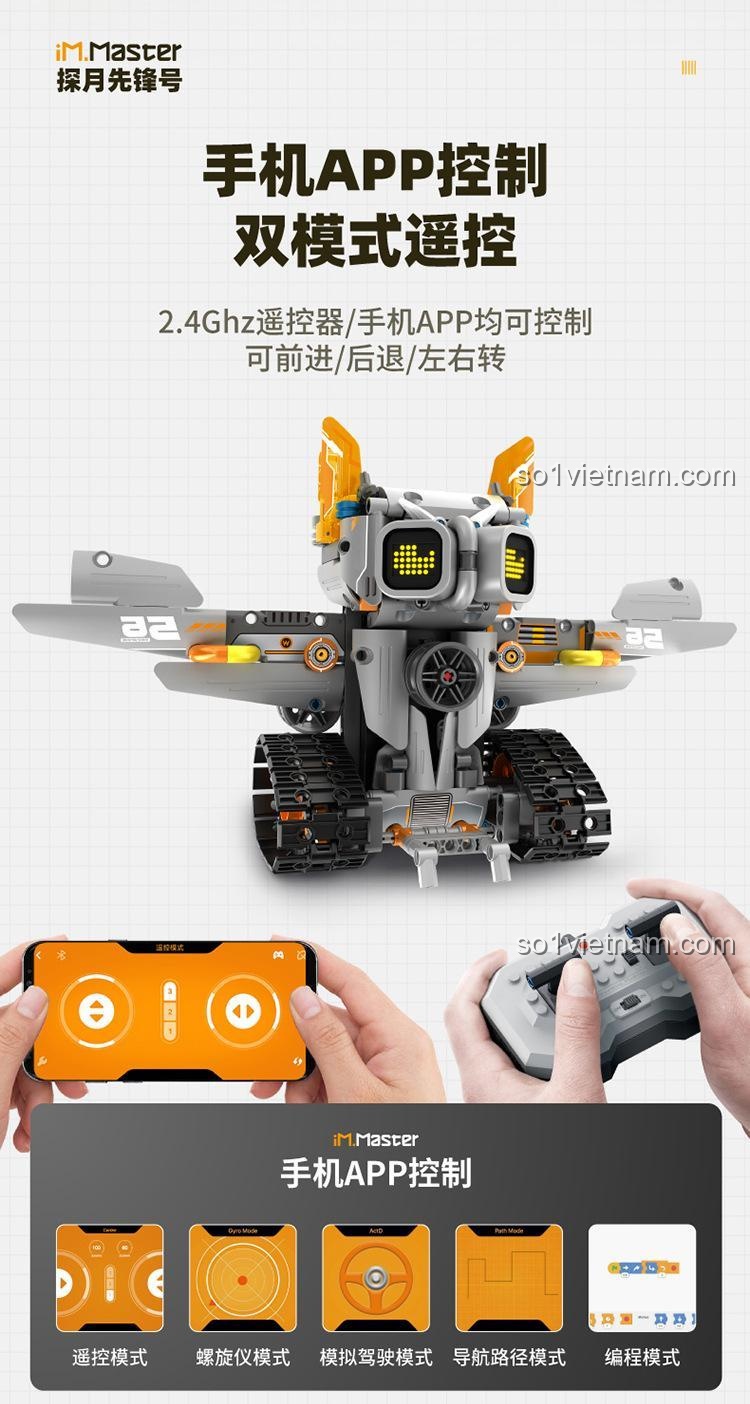 - Điều khiển qua Ứng dụng (APP): Tải ứng dụng miễn phí để khám phá các chế độ điều khiển nâng cao như: lái xe, lái xoay vòng, lái mô phỏng, lái dẫn đường và đặc biệt là chế độ lập trình. Bé có thể tự tay tạo ra các kịch bản di chuyển cho robot của mình!