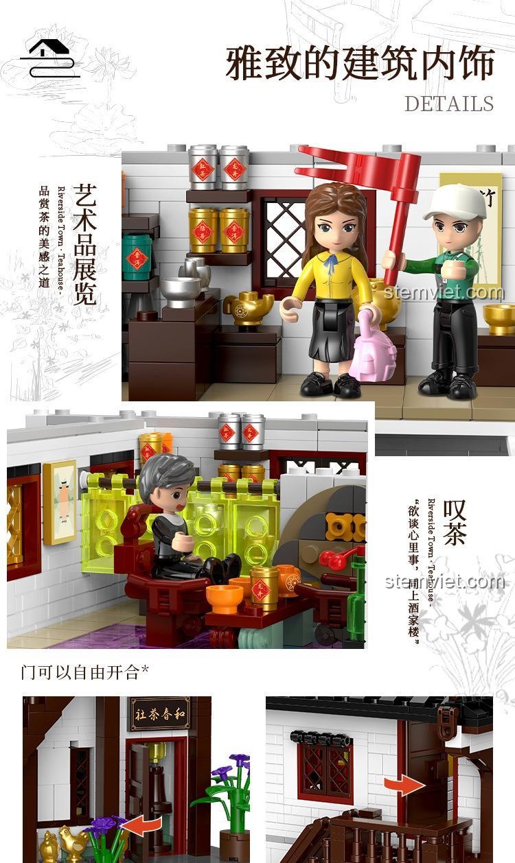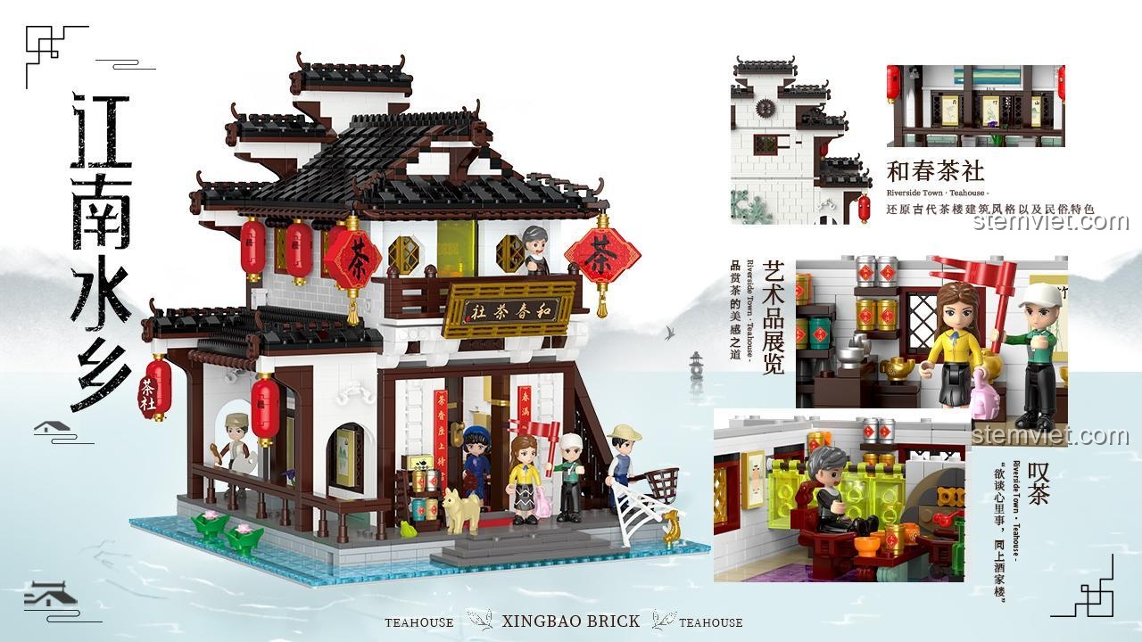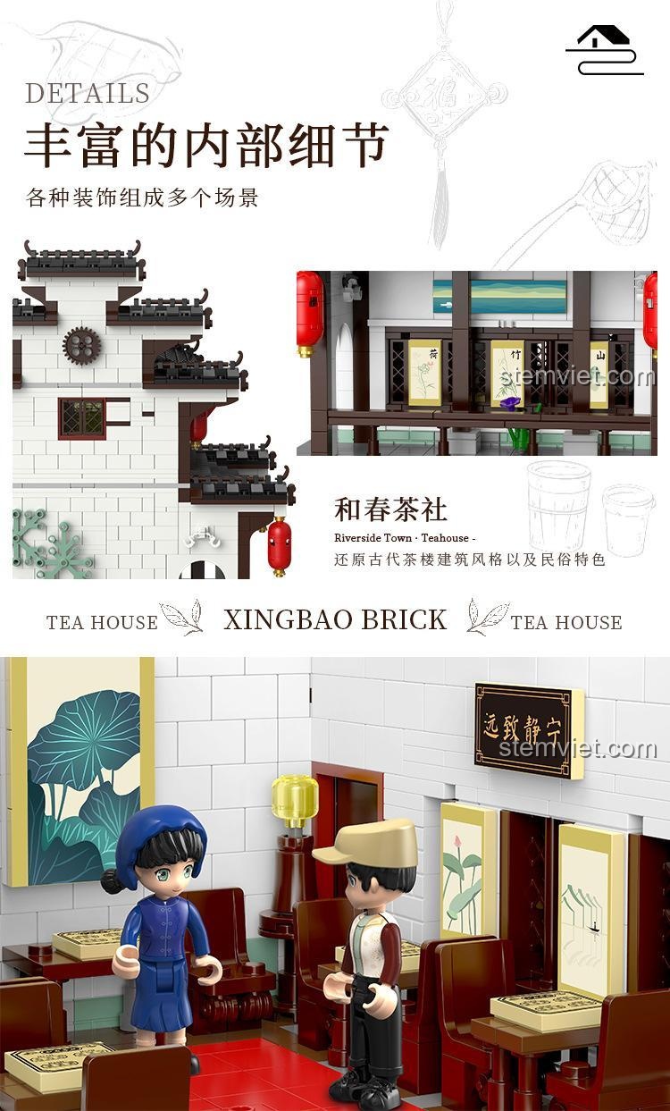 Điều gì làm nên sức hút của đồ chơi mô hình XINGBAO? Đó chính là sự chăm chút đến từng chi tiết nhỏ nhất. Mô hình Tiệm Trà Hòa Xuân có kích thước ấn tượng 27.8 x 26.5 x 29.1 cm, tái hiện hoàn hảo một công trình kiến trúc cổ ven sông. Từ mái ngói âm dương cong vút đặc trưng, những chiếc đèn lồng đỏ treo cao mang lại may mắn, đến biển hiệu ‘Hòa Xuân Trà Xã’ được chế tác tinh tế, tất cả đều toát lên một vẻ đẹp hoài cổ và trang nhã. Đặc biệt, thiết kế module thông minh cho phép bạn dễ dàng nhấc riêng từng tầng để khám phá không gian nội thất được bài trí công phu bên trong, từ những bộ bàn ghế thưởng trà, quầy pha chế, cho đến các bức tranh thư pháp treo tường. Sáu nhân vật minifigures đi kèm – từ ông chủ tiệm, người phục vụ, đến các vị khách như họa sĩ, ngư phủ – sẽ thổi hồn cho câu chuyện của bạn, tạo nên một khung cảnh sinh hoạt đời thường vô cùng sống động.