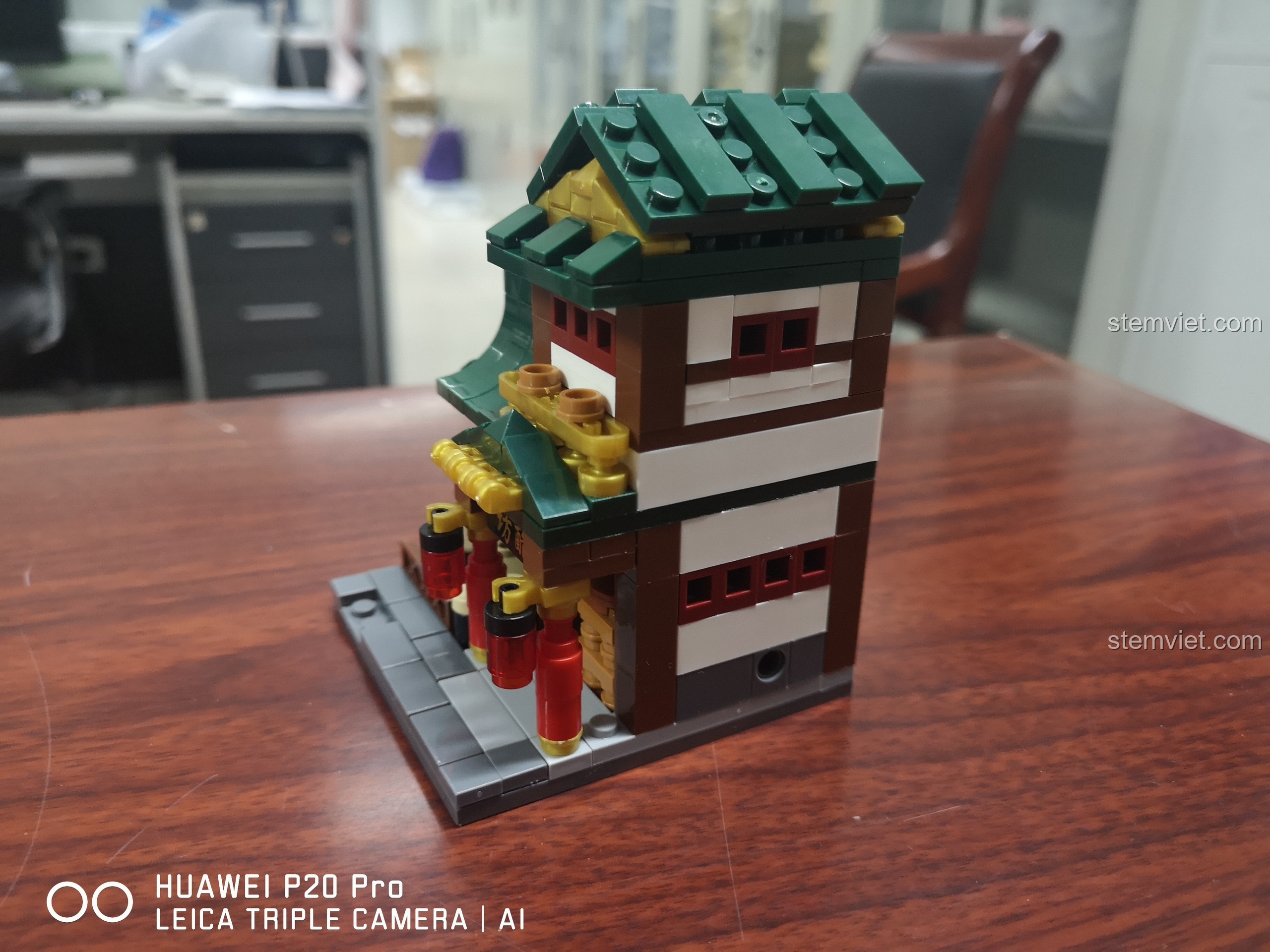 Mô hình Cửa Hàng Giấm Phố Cổ Trung Hoa XINGBAO XB-01103 nổi bật với thiết kế vô cùng độc đáo và chi tiết. Với 355 mảnh ghép, mô hình tái hiện một cách chân thực một cửa hàng giấm truyền thống với mái ngói xanh lá đặc trưng, tường trắng và nâu ấm áp, cùng những chi tiết trang trí màu đỏ và vàng rực rỡ. Từng khối lắp ghép được thiết kế tỉ mỉ, đảm bảo độ khớp nối hoàn hảo, tạo nên một tổng thể vững chắc và đẹp mắt. Bạn sẽ ấn tượng với những chiếc đèn lồng đỏ treo trước cửa, những thùng giấm gỗ nâu bên trong, và cả những chi tiết nhỏ như cửa sổ, bậc thang, tất cả đều góp phần tạo nên một không gian sống động. Dù không có thông số kích thước cụ thể, nhưng qua hình ảnh, bạn có thể thấy đây là một mô hình thu nhỏ lý tưởng để trưng bày trên bàn học, kệ sách hoặc trong bộ sưu tập của bạn. Đây thực sự là một đồ chơi lắp ghép Kiến trúc cổ điển đáng để khám phá.