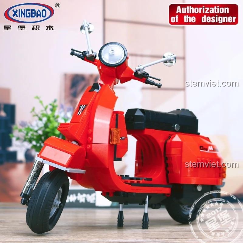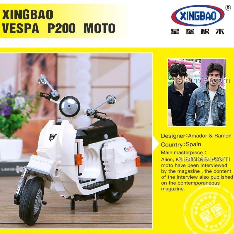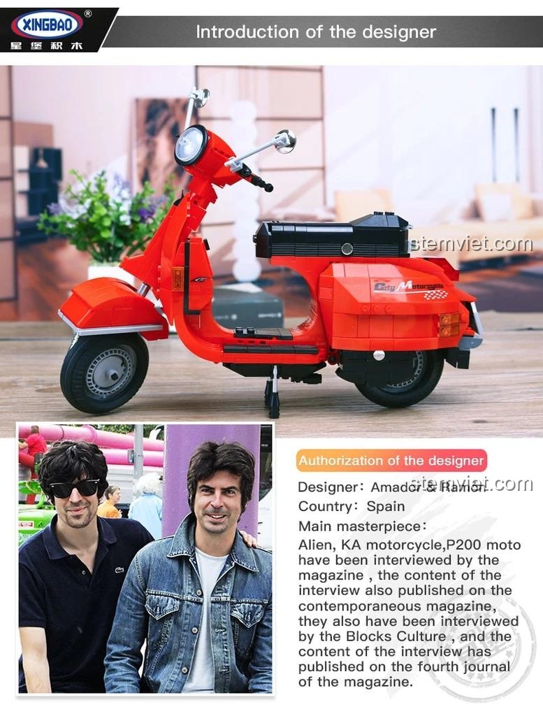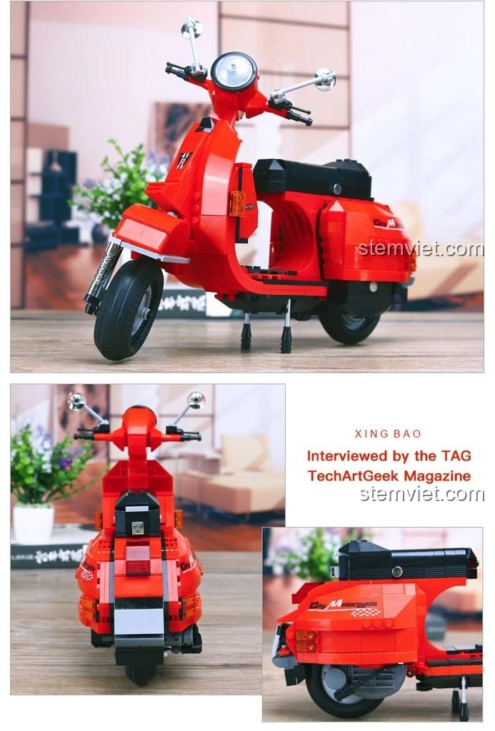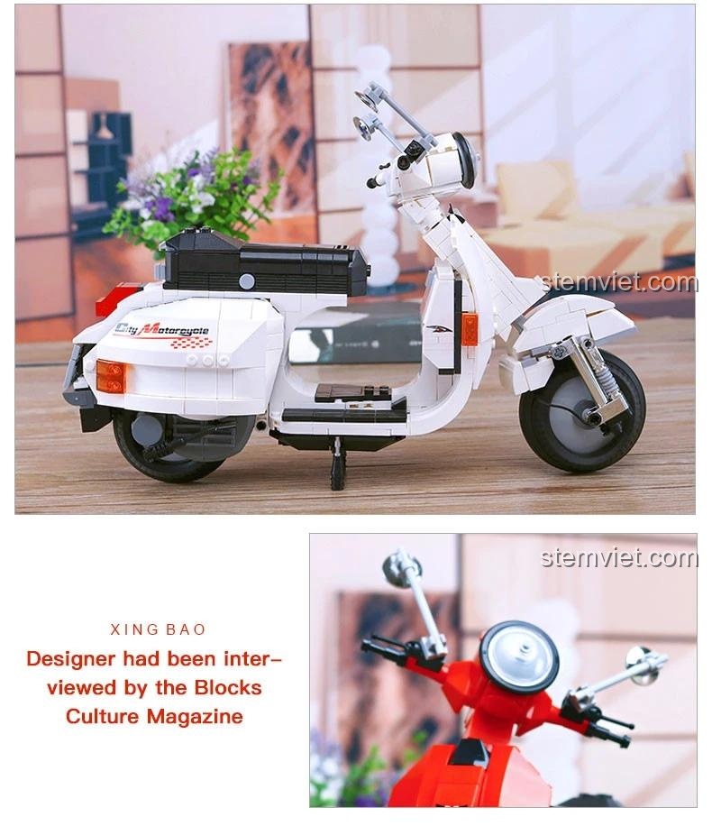 Bố có thể thấy, đồ chơi mô hình XINGBAO này không phải là một chiếc xe máy thông thường. Nó được thiết kế bởi Arvo Brothers, những nhà thiết kế MOC (My Own Creation – Sáng tạo của riêng tôi) lừng danh, đảm bảo mỗi chi tiết đều được chăm chút tỉ mỉ để tái hiện chân thực nhất vẻ đẹp của chiếc Vespa P200 huyền thoại. Từ đường cong mềm mại của yếm xe, chiếc đèn pha tròn cổ điển, cho đến yên xe đen bóng và phần đuôi xe đặc trưng, tất cả đều toát lên một phong cách retro đầy cuốn hút. Với kích thước sau khi hoàn thành dài 30cm, cao 17cm và rộng 9cm, mô hình có tỷ lệ cân đối, vững chãi, rất phù hợp để trưng bày trên bàn học hoặc kệ sách của bé. Các chi tiết nhỏ như tay lái, gương chiếu hậu, phanh tay, và cả chân chống đều được mô phỏng chính xác, mang lại một tổng thể hài hòa và sống động. Đây thực sự là một tác phẩm nghệ thuật bằng gạch, một món đồ chơi chất lượng cao mà bé sẽ tự hào khi khoe với bạn bè.