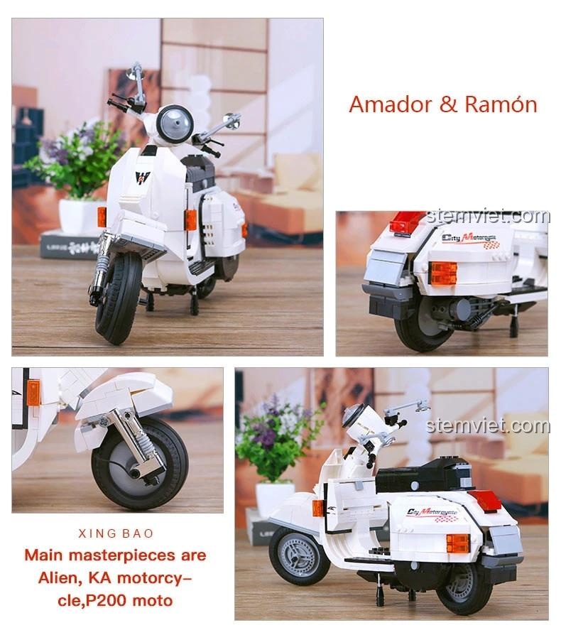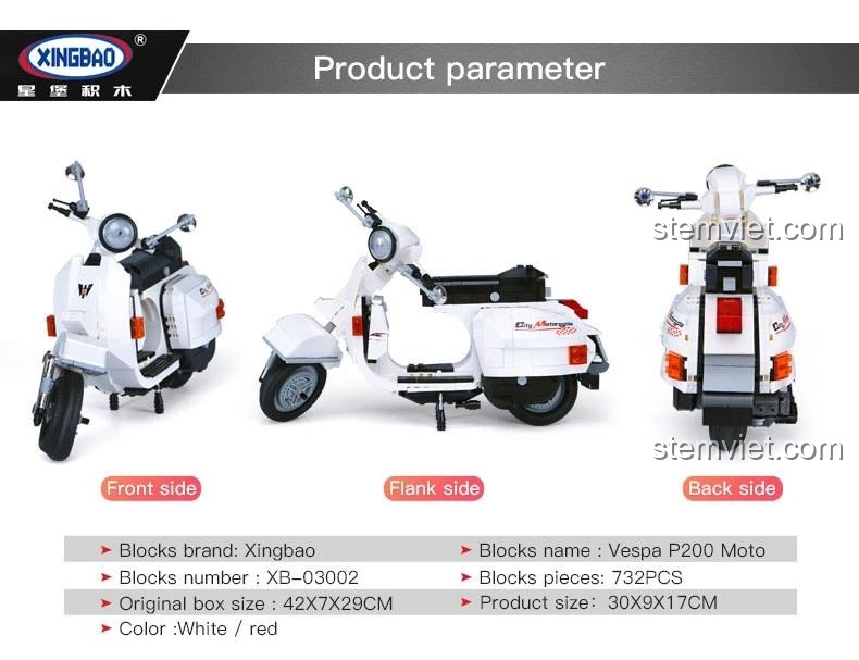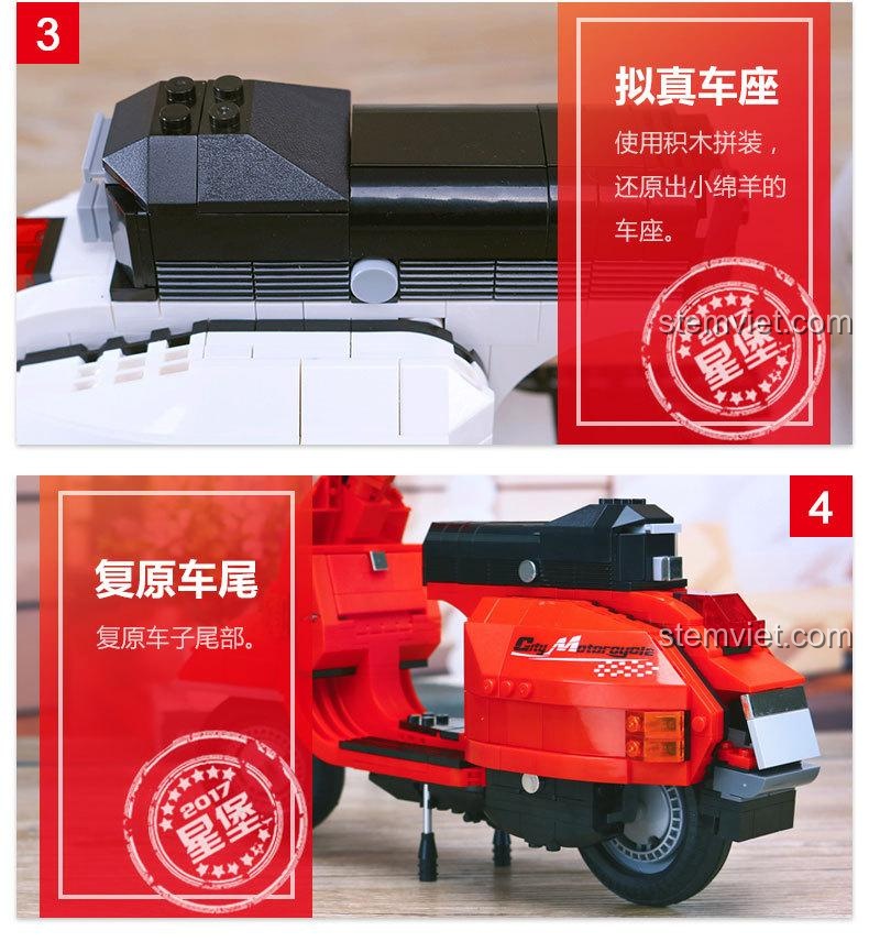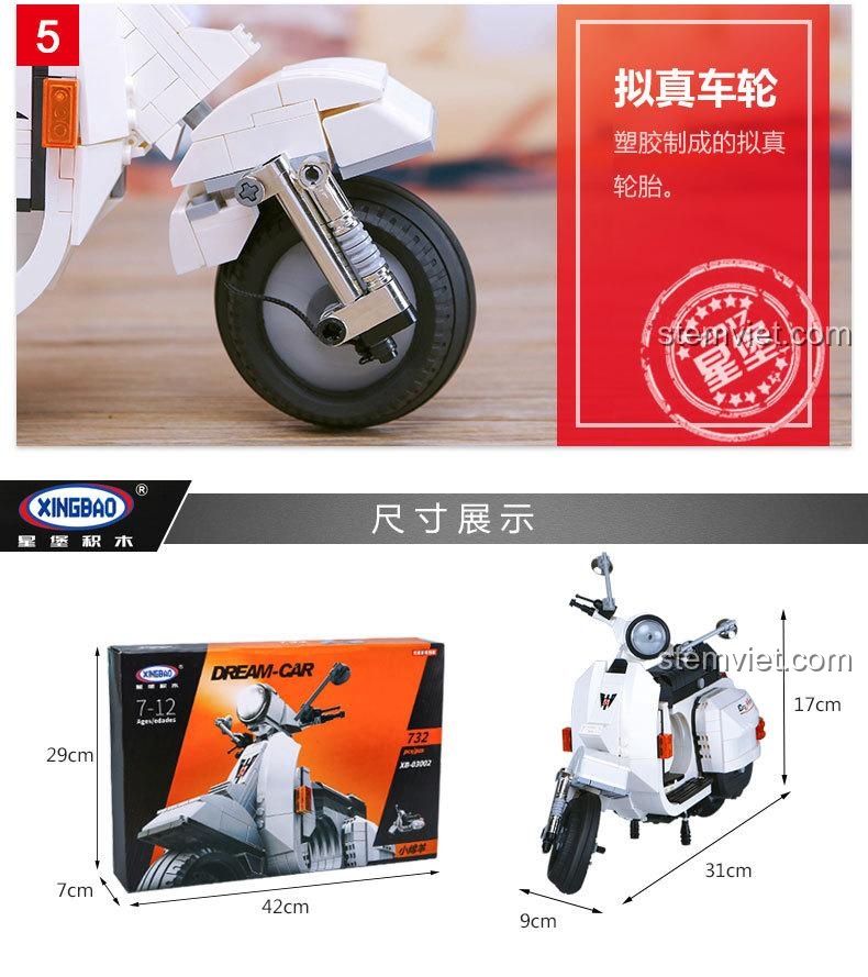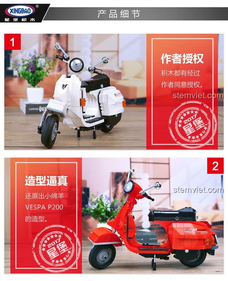 Bố có thể thấy, đồ chơi mô hình XINGBAO này không phải là một chiếc xe máy thông thường. Nó được thiết kế bởi Arvo Brothers, những nhà thiết kế MOC (My Own Creation – Sáng tạo của riêng tôi) lừng danh, đảm bảo mỗi chi tiết đều được chăm chút tỉ mỉ để tái hiện chân thực nhất vẻ đẹp của chiếc Vespa P200 huyền thoại. Từ đường cong mềm mại của yếm xe, chiếc đèn pha tròn cổ điển, cho đến yên xe đen bóng và phần đuôi xe đặc trưng, tất cả đều toát lên một phong cách retro đầy cuốn hút. Với kích thước sau khi hoàn thành dài 30cm, cao 17cm và rộng 9cm, mô hình có tỷ lệ cân đối, vững chãi, rất phù hợp để trưng bày trên bàn học hoặc kệ sách của bé. Các chi tiết nhỏ như tay lái, gương chiếu hậu, phanh tay, và cả chân chống đều được mô phỏng chính xác, mang lại một tổng thể hài hòa và sống động. Đây thực sự là một tác phẩm nghệ thuật bằng gạch, một món đồ chơi chất lượng cao mà bé sẽ tự hào khi khoe với bạn bè.