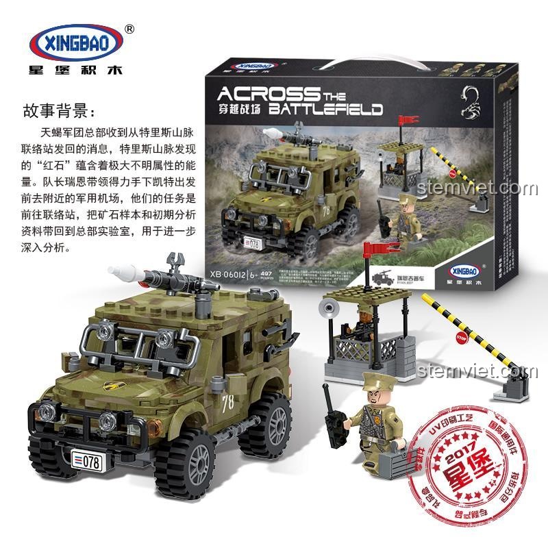 Cửa sau của xe cũng có thể mở ra, tạo không gian cho việc vận chuyển đồ đạc hoặc binh lính. Bên cạnh chiếc Jeep, bộ sản phẩm còn bao gồm một trạm kiểm soát với thanh chắn có thể nâng lên hạ xuống, mô phỏng hoạt động kiểm tra an ninh trên chiến trường. Với 3 minifigure lính đi kèm, mỗi nhân vật đều có khả năng cử động linh hoạt, cho phép bé tạo ra vô số kịch bản hành động, từ tuần tra, phục kích đến giải cứu con tin. Tất cả những tính năng này biến Xe Jeep quân sự XB-06012 thành một món đồ chơi đầy hấp dẫn, kích thích trí tưởng tượng và khả năng nhập vai của bé.
