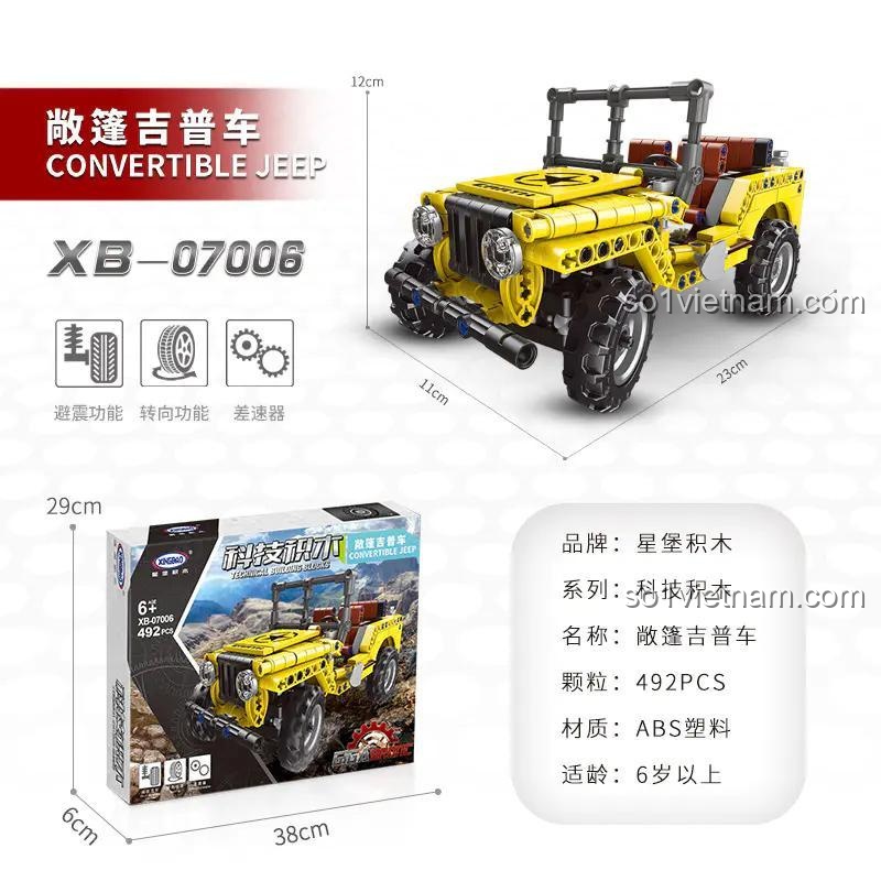 Bộ đồ chơi XB-07006 Xe Jeep Mui Trần là một minh chứng cho sự tinh xảo trong thiết kế của XINGBAO. Với 492 mảnh ghép, mô hình này được tái hiện một cách chân thực với màu vàng chủ đạo nổi bật, mang đến vẻ ngoài mạnh mẽ và cuốn hút. Kích thước mô hình sau khi hoàn thiện là 23cm chiều dài, 11cm chiều rộng và 12cm chiều cao, tạo nên một chiếc xe Jeep vừa vặn để bé dễ dàng cầm nắm và chơi đùa. Từng chi tiết của chiếc xe, từ phần mui trần cá tính, bộ lốp gai lớn hầm hố cho đến khung xe chắc chắn, đều được chăm chút tỉ mỉ. Đặc biệt, các chi tiết kỹ thuật như hệ thống treo, lái và bộ vi sai được thiết kế lộ ra ngoài, không chỉ tăng tính thẩm mỹ mà còn giúp bé dễ dàng quan sát và hiểu rõ hơn về cơ chế hoạt động của xe. Đây không chỉ là một đồ chơi mô hình mà còn là một tác phẩm nghệ thuật kỹ thuật, kích thích trí tò mò và khả năng quan sát của bé trai 6 tuổi.