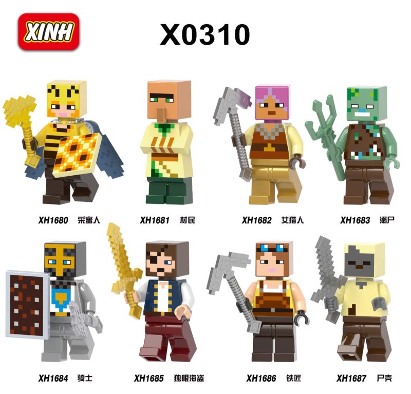 Bộ Minifigures Minecraft X0310 bao gồm 8 nhân vật độc đáo từ thế giới Minecraft, mỗi nhân vật đều có thiết kế và phụ kiện riêng biệt. Các nhân vật bao gồm Người Ong, Dân Làng, Thợ Săn, Zombie, Hiệp Sĩ, Cướp Biển Một Mắt, Thợ Rèn và Xác Ướp, mang đến sự đa dạng cho các câu chuyện của bé.