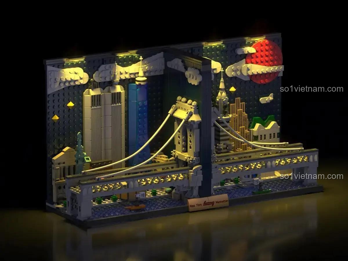 XMORK 028008 không chỉ để ngắm. Tính năng cốt lõi của nó là một cặp chặn sách (bookend) cực kỳ phong cách. Hãy để đường chân trời Manhattan nâng đỡ những tri thức và cuộc phiêu lưu trong từng trang sách của bạn. Thiết kế tách rời linh hoạt cho phép bạn tùy chỉnh khoảng cách, phù hợp với mọi số lượng sách trên kệ. Nhưng điều kỳ diệu chưa dừng lại ở đó. Hãy tưởng tượng khi màn đêm buông xuống, bạn bật công tắc và toàn bộ mô hình bừng sáng. Bằng cách trang bị thêm một bộ đèn LED (được bán riêng), bạn có thể biến mô hình của mình thành một New York về đêm lung linh, huyền ảo. Ánh đèn vàng ấm áp từ các ô cửa sổ, ánh sáng trắng nổi bật cây cầu, tất cả tạo nên một khung cảnh đẹp đến nao lòng, một điểm nhấn không thể rời mắt trong căn phòng của bạn. Đây chính là tính năng biến một mô hình lắp ráp thành một tác phẩm nghệ thuật thực thụ.