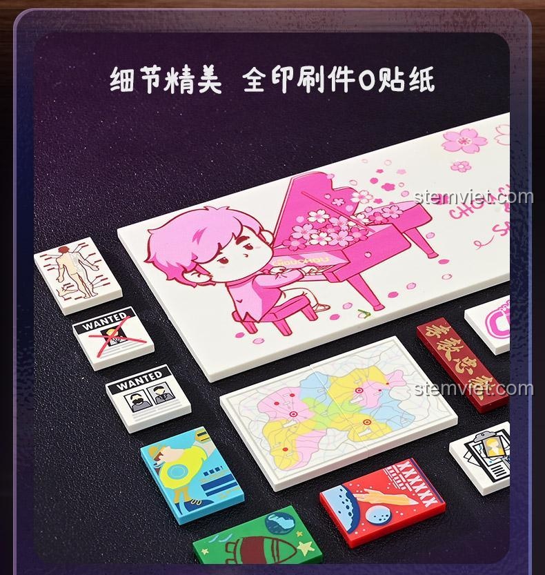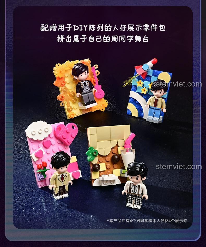 Bộ sản phẩm đi kèm 4 minifigures Châu Kiệt Luân trong 4 bộ trang phục đặc trưng cho từng MV, cùng với 4 bệ trưng bày riêng để bạn có thể sáng tạo sân khấu của riêng mình. Đặc biệt, toàn bộ các chi tiết hoa văn, chữ viết, hình ảnh trên sản phẩm đều là chi tiết in 100%, không sử dụng sticker. Điều này không chỉ giúp mô hình trông cao cấp, bền đẹp hơn theo thời gian mà còn giúp quá trình lắp ráp của các bạn nhỏ trở nên dễ dàng và thú vị hơn, không còn phải lo lắng về việc dán lệch hay bong tróc.