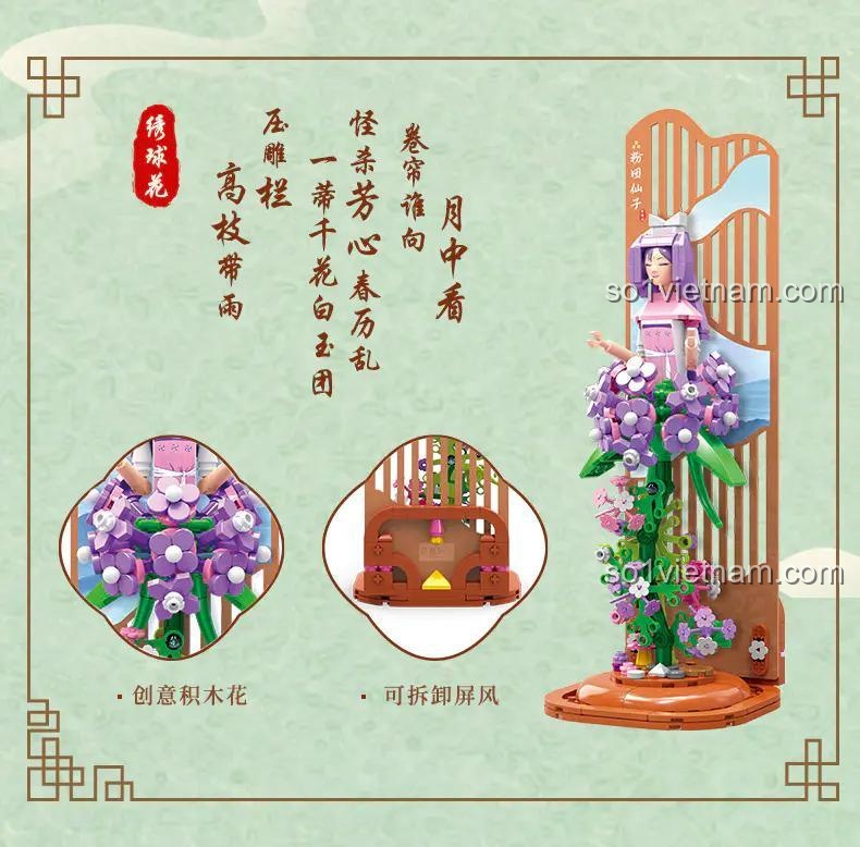 Ngay từ cái nhìn đầu tiên, bộ đồ chơi mô hình Tiên Tử Hoa này đã gây ấn tượng mạnh mẽ bởi thiết kế vô cùng tinh xảo và tỉ mỉ. Nàng Tiên Tử Hoa Phấn Đoàn được khắc họa với vẻ đẹp dịu dàng, thanh thoát, khoác lên mình bộ trang phục màu hồng và tím pastel nhẹ nhàng, hài hòa với những bông hoa phấn đoàn rực rỡ. Mô hình có chiều cao khoảng 25cm, chiều dài và chiều rộng khoảng 10cm, tạo nên một tổng thể cân đối và duyên dáng, rất phù hợp để trưng bày. Mỗi chi tiết hoa, lá, hay nếp áo đều được chăm chút kỹ lưỡng, mang đến cảm giác chân thực và sống động. Đặc biệt, bộ lắp ghép ZDEL 50406 còn đi kèm một màn hình trang trí phía sau, làm tăng thêm vẻ đẹp cổ điển và lãng mạn cho tổng thể mô hình. Màu sắc chủ đạo là hồng, tím, xanh lá và nâu được phối hợp khéo léo, tạo nên một bức tranh hài hòa, kích thích thị giác và cảm nhận thẩm mỹ của bé.