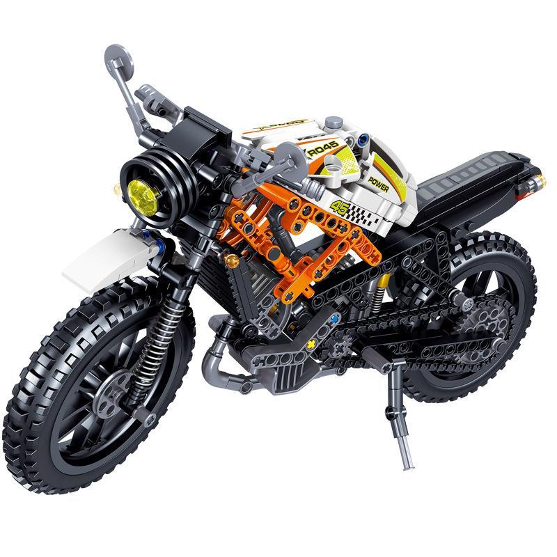 Mỗi mảnh ghép của đồ chơi mô hình QL0482 đều được thiết kế tỉ mỉ, tái hiện chân thực các bộ phận của một chiếc mô tô địa hình thực thụ. Từ bộ lốp gai lớn, bám đường, đến hệ thống ống xả kép mạnh mẽ, đèn pha sắc nét và khung sườn Technic lộ rõ các chi tiết máy móc phức tạp. Đặc biệt, phần động cơ được mô phỏng một cách sống động, mang đến cảm giác như đang chiêm ngưỡng một cỗ máy thu nhỏ đầy uy lực. Các chi tiết màu cam nổi bật trên nền đen và xám tạo điểm nhấn thị giác, thu hút sự chú ý của bé và kích thích trí tưởng tượng.