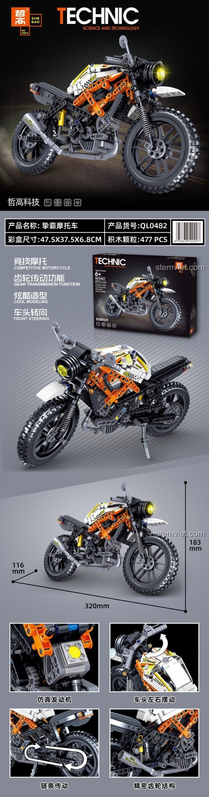 Bộ lắp ráp Zhe Gao QL0482 Mô tô Địa Hình Cạnh Tranh không chỉ đẹp mắt mà còn sở hữu những tính năng cơ khí Mô phỏng động cơ, Hệ thống lái hoạt động, Truyền động xích, Cấu trúc bánh răng chính xác, 477 chi tiết độc đáo, mang đến trải nghiệm chơi vô cùng chân thực và hấp dẫn. Với 477 chi tiết, mô hình này được thiết kế theo kiểu chi tiết Tương thích LEGO® Technic, cho phép bé khám phá sâu hơn về cơ chế hoạt động của một chiếc mô tô thực thụ.